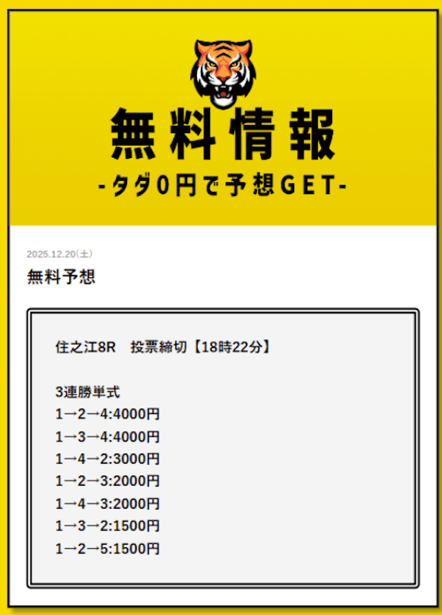 | 住之江8R(1-2-4) | 対象サイト:タイガーボート 公開された予想 払戻金:32,000円 | ![]() |