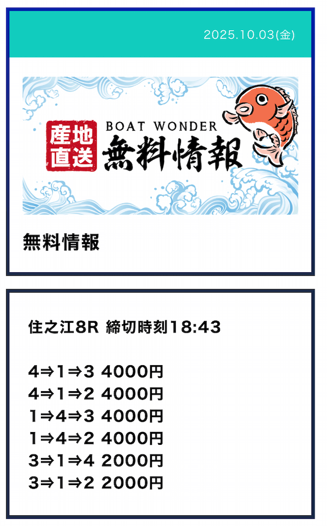 - 2025/10/08的中 無料予想で74,000円獲得2025/10/03的中 無料予想で86,800円獲得2025/10/02的中 無料予想で39,600円獲得2025/10/02的中 無料予想で30,000円獲得2025/10/01的中 無料予想で103,800円獲得2025/09/25的中 無料予想で27,600円獲得2025/09/25的中 無料予想で216,400円獲得2025/09/21的中 無料予想で51,200円獲得2025/09/19的中 無料予想で43,200円獲得2025/09/17的中 無料予想で382,000円獲得