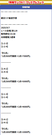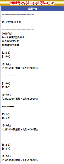 2025/9/7 プレミアムコース 情報料金+舟券代 0円+18,000円 |