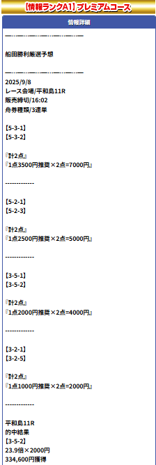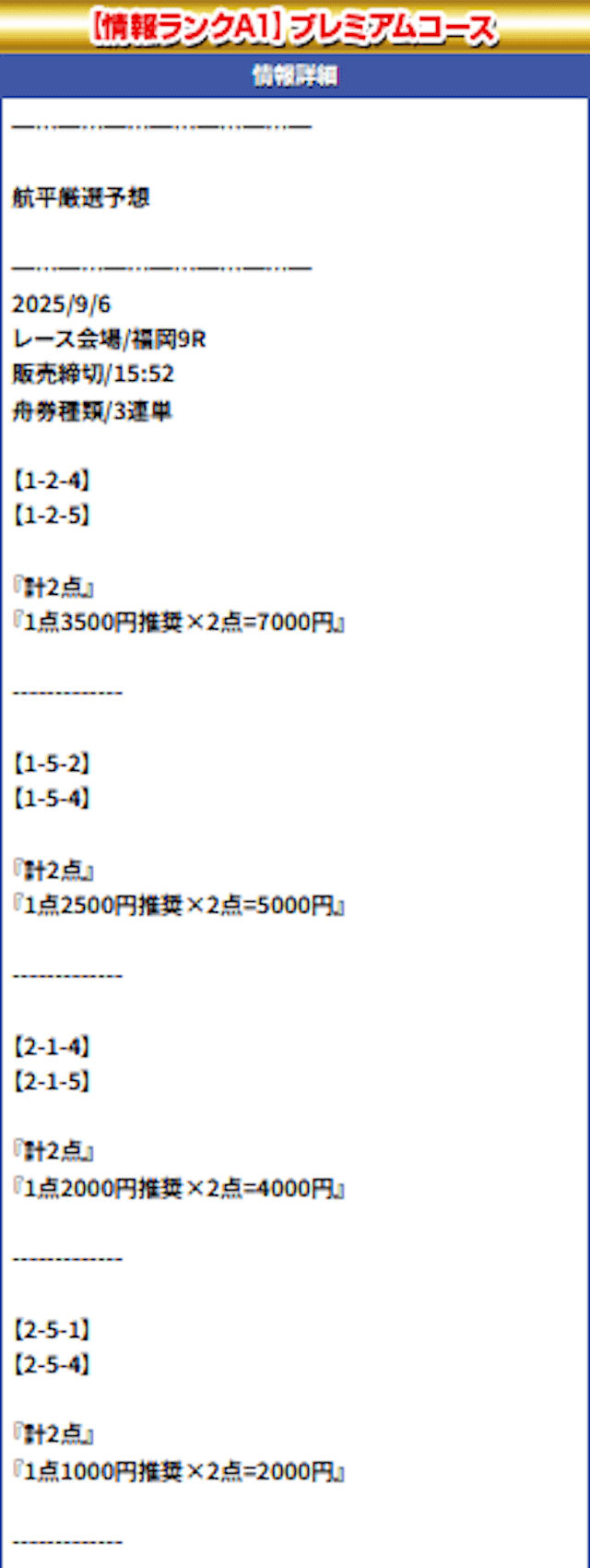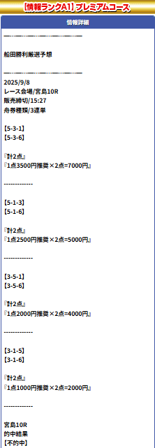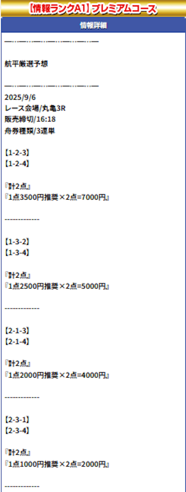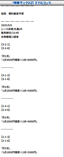 2025/9/6 プレミアムコース 情報料金+舟券代 0円+18,000円 |