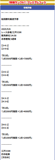- 一部予想の買い目が多すぎて、資金効率が悪くなることも。絞ってくれると助かる。投稿日:2025/08/13
