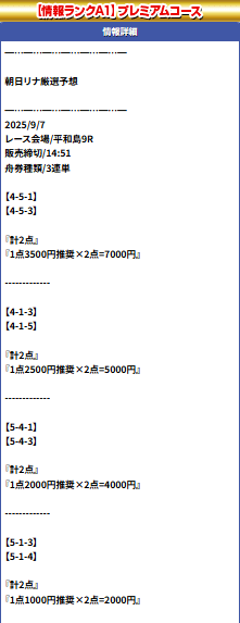 2025/9/7 プレミアムコース 情報料金+舟券代 30,000円+18,000円 |