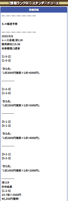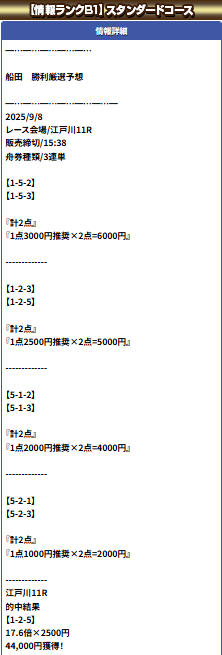 2025/9/8 スタンダードコース 情報料金+舟券代 5,000円+17,000円 |