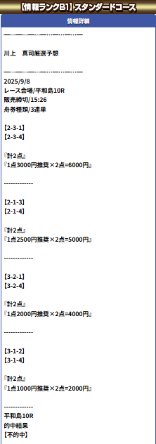 2025/9/8 スタンダードコース 情報料金+舟券代 0円+17,000円 |