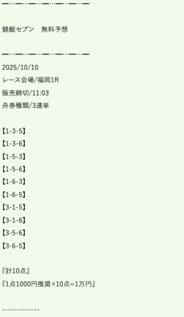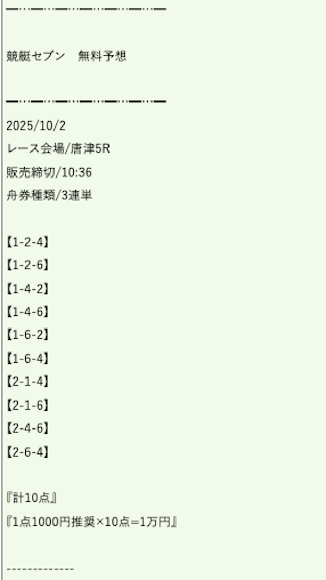 - 競艇セブンの無料予想は穴狙いのレースを普通に的中させてくるから、他の競艇予想サイトとは一味違う感じがある。無料でここまでやれるのは本当に助かるな。投稿日:2025/09/03