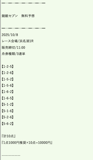 - 最初は無料予想だけ参加してみたんだけど、いきなり50倍の的中。正直「まぐれだろ」と思ってたけど、次の日も当たってさすがに驚いた。今は中堅プランで地道に日銭稼いでる感じ。投稿日:2025/09/04