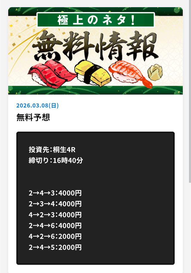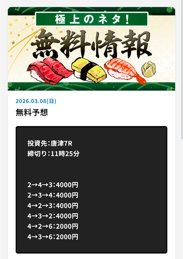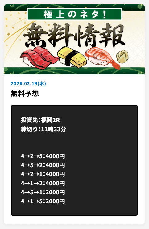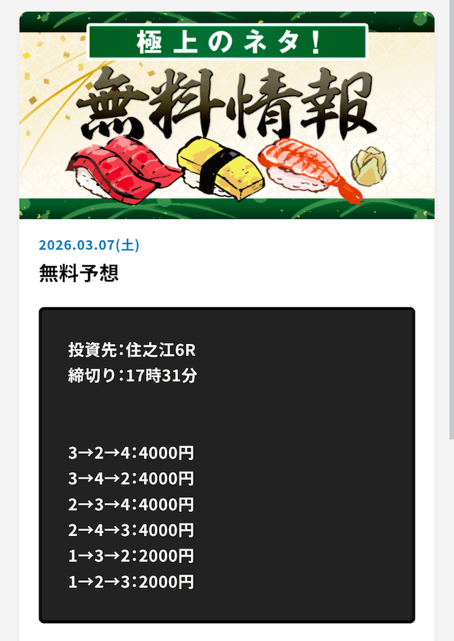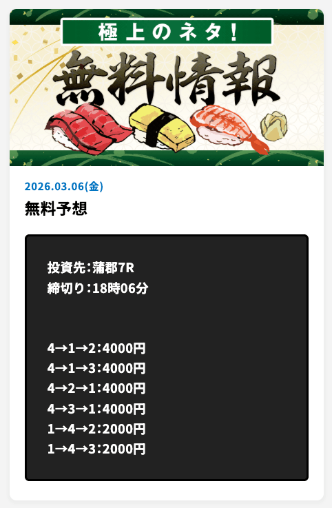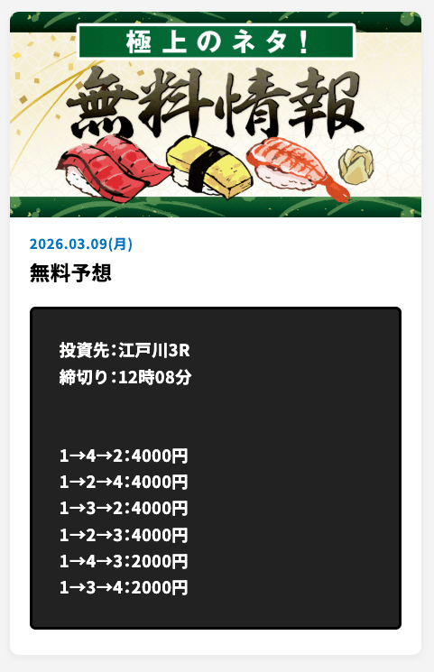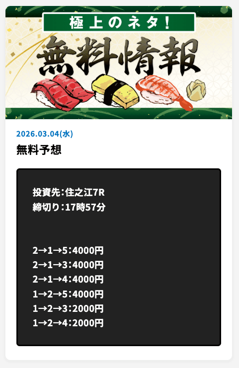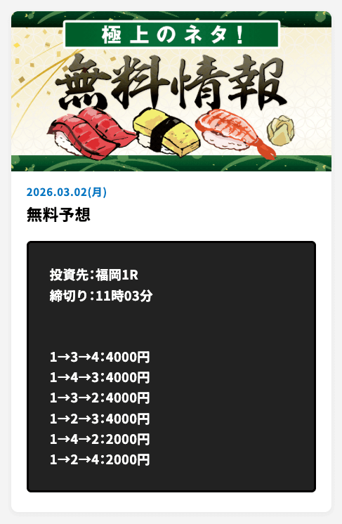 - 2026/03/14的中 無料予想で24,400円獲得2026/03/13的中 無料予想で25,200円獲得2026/03/11的中 無料予想で22,400円獲得2026/03/11的中 無料予想で25,400円獲得2026/03/09的中 無料予想で60,000円獲得2026/03/06的中 無料予想で28,400円獲得2026/03/05的中 無料予想で50,000円獲得2026/03/04的中 無料予想で25,800円獲得2026/03/02的中 無料予想で27,600円獲得2026/03/02的中 無料予想で24,800円獲得