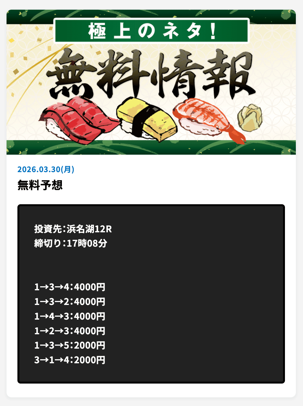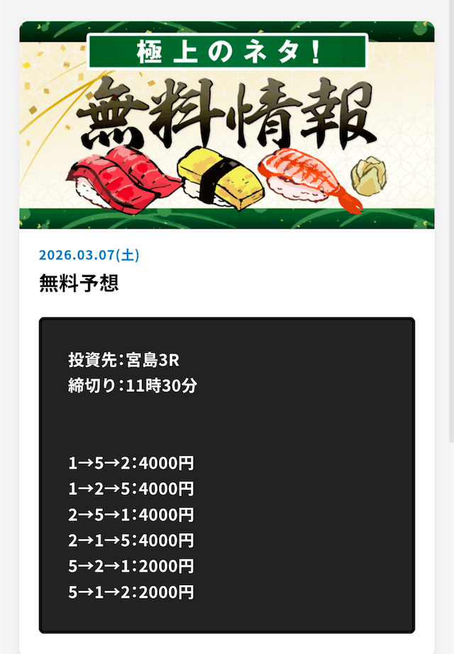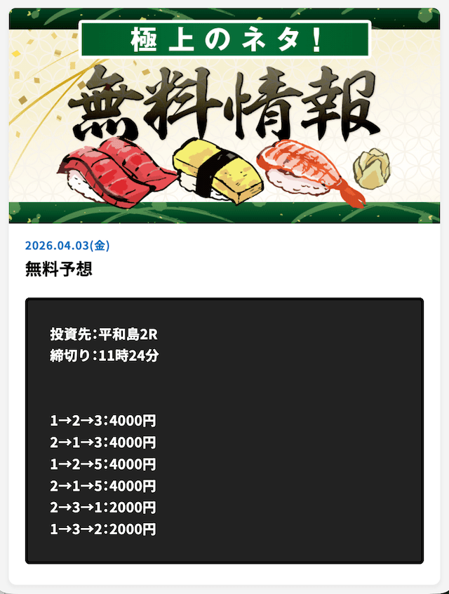 | 2024/5/3 ポイント情報 情報料金+舟券代 10,000円+円 |