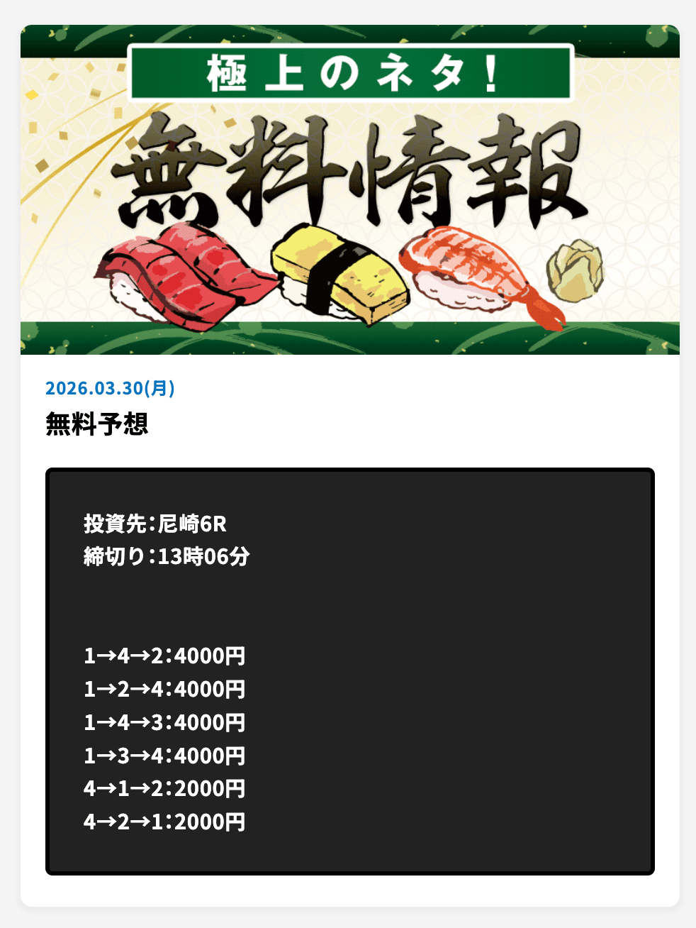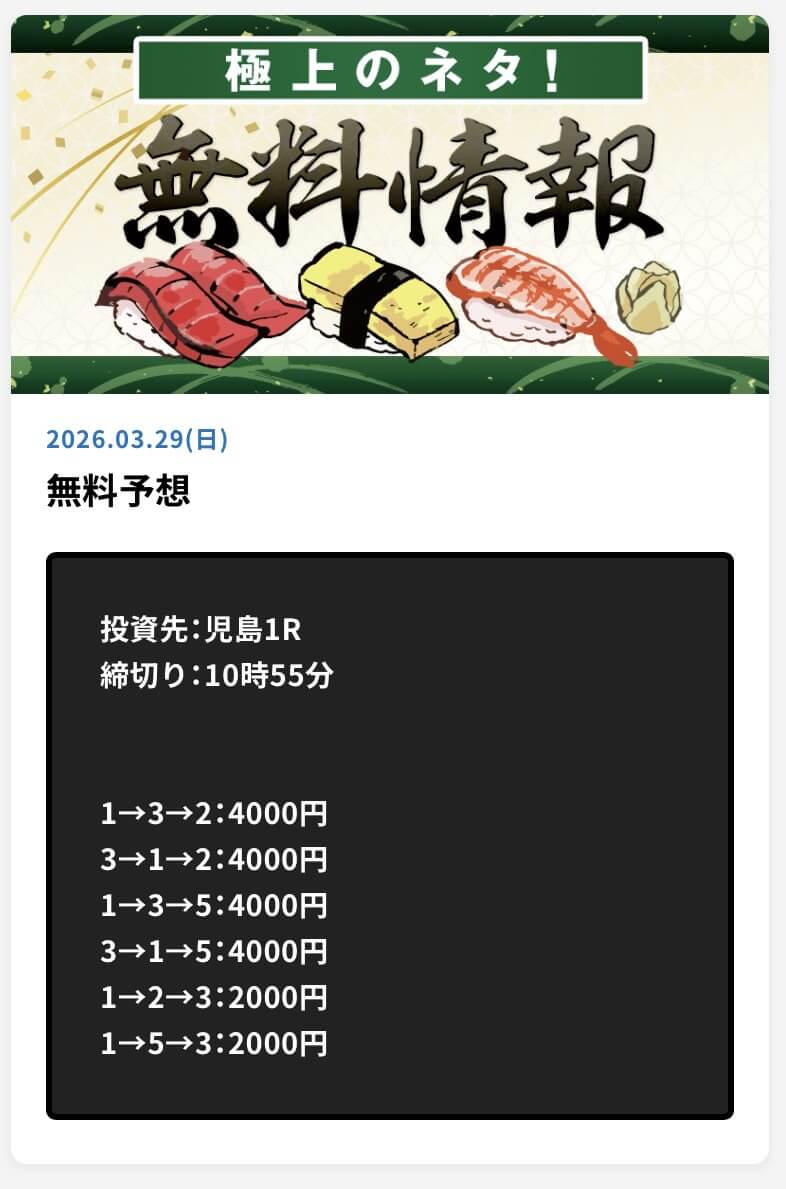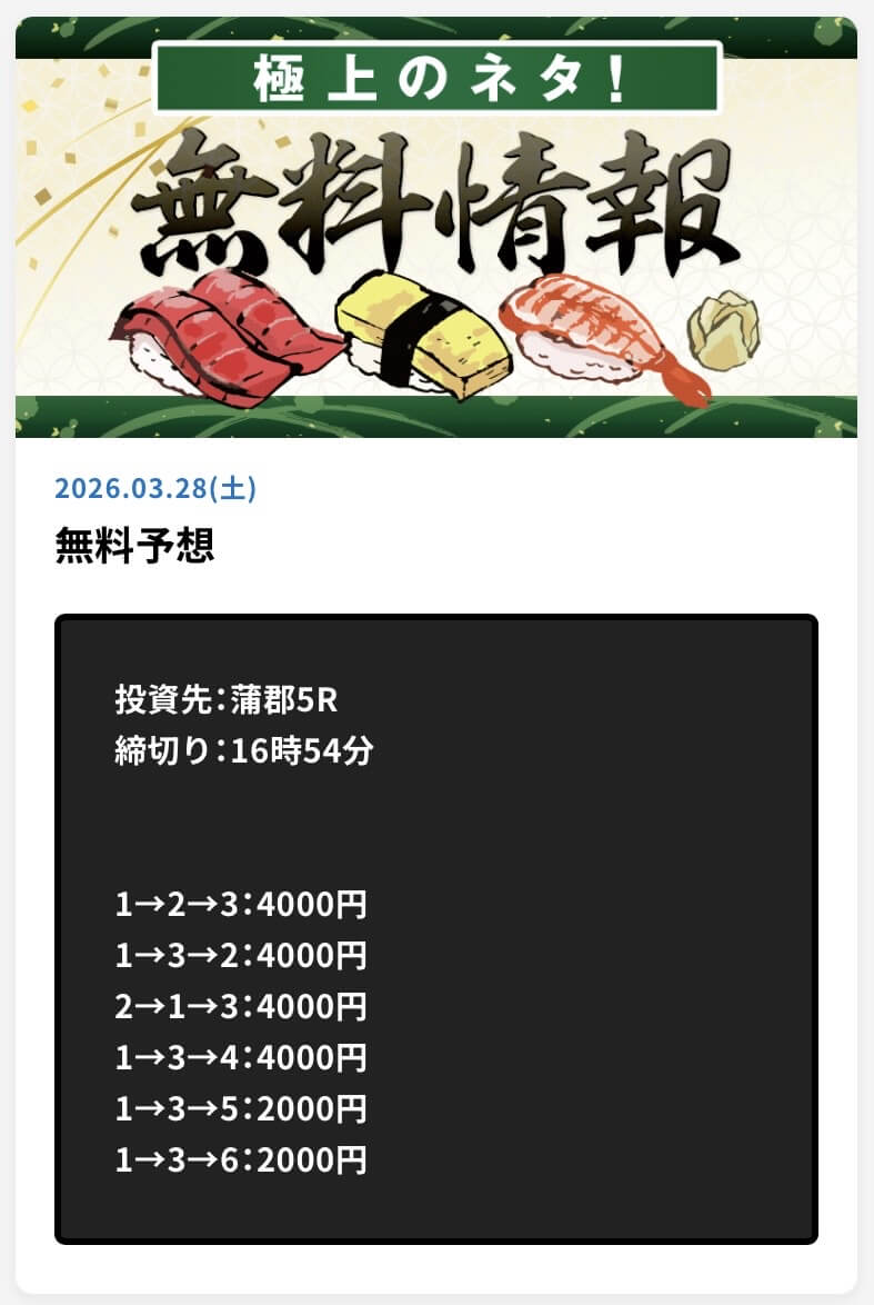 - 2026/04/08的中 無料予想で31,200円獲得2026/04/05的中 無料予想で206,800円獲得2026/04/03的中 無料予想で32,800円獲得2026/04/01的中 無料予想で22,000円獲得2026/03/30的中 無料予想で22,800円獲得2026/03/28的中 無料予想で22,800円獲得2026/03/28的中 無料予想で46,400円獲得2026/03/27的中 無料予想で33,200円獲得2026/03/27的中 無料予想で26,000円獲得2026/03/26的中 無料予想で198,800円獲得