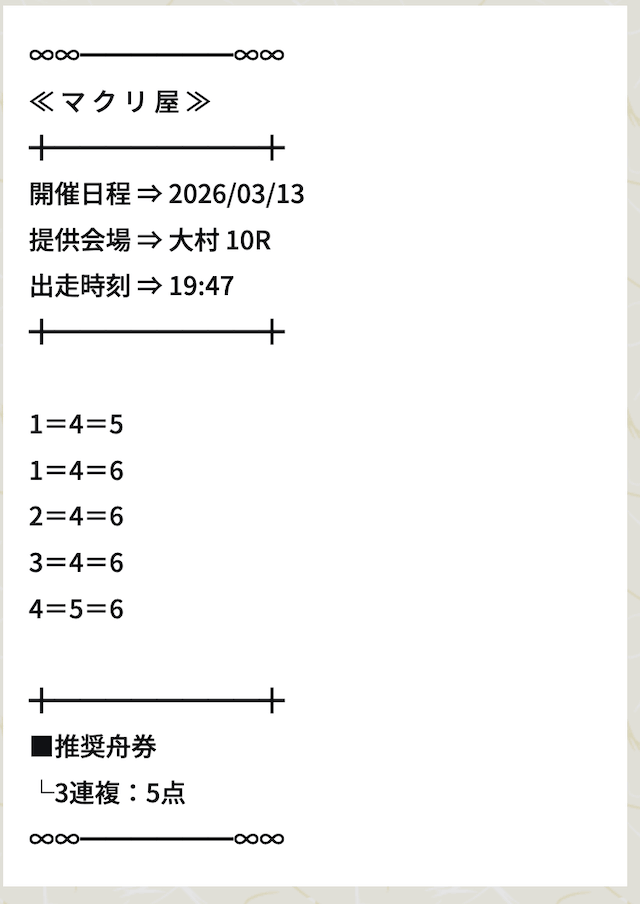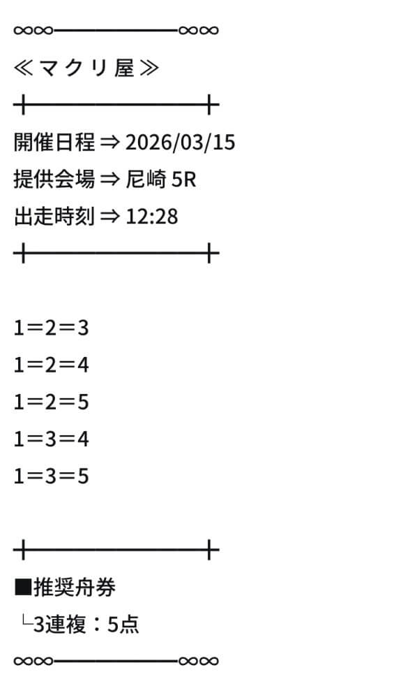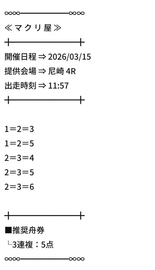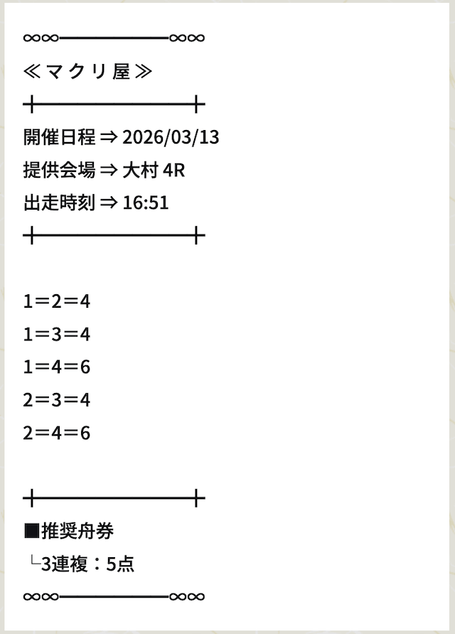 匿名無料予想の買い目5点のうち、2点がトリガミになるようなオッズの時がある。的中率を上げるための保険なんだろうけど、ギャンブルなんだからもっと利益を追求した買い目が見たい。投稿日:2026/03/09