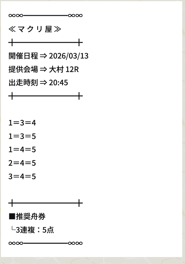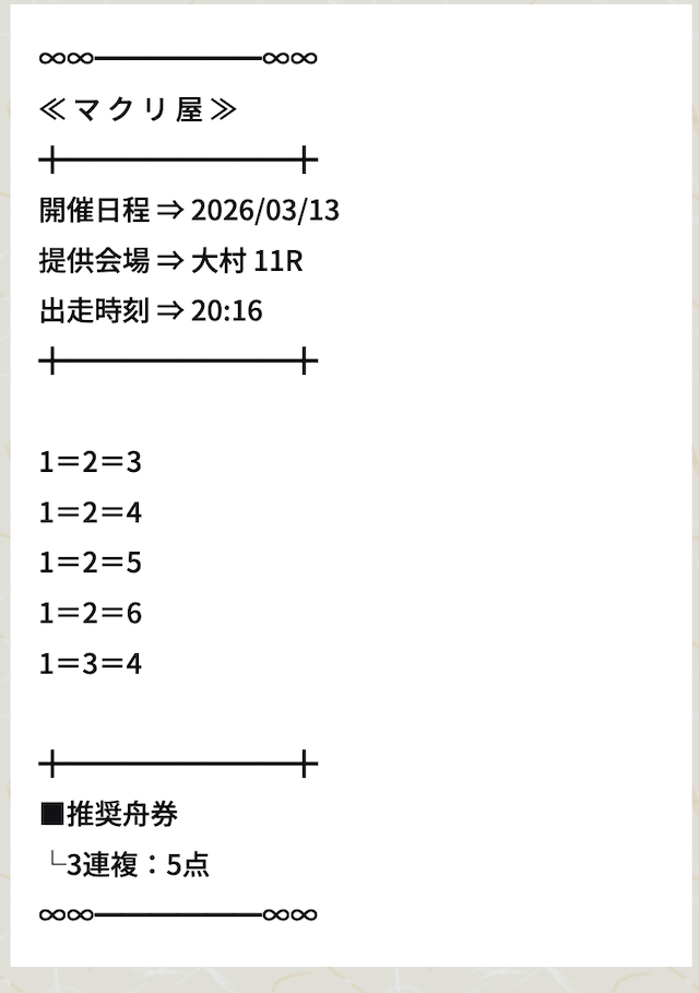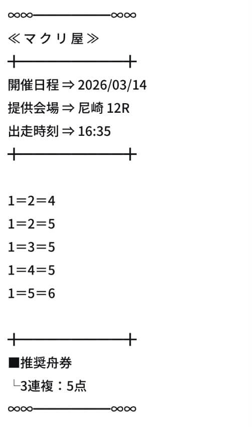 匿名3/10の無料予想、平和島7Rで5号艇が絡む展開を見事に的中。11万円以上の払い戻し!三連複で万舟ってなかなかお目にかかれないけど、マクリ屋なら日常茶飯事なのかもしれない。投稿日:2026/03/12