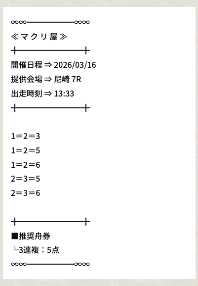 | 2026/03/09 | 戸田10R [📷] | ○ | 83,600円 |
