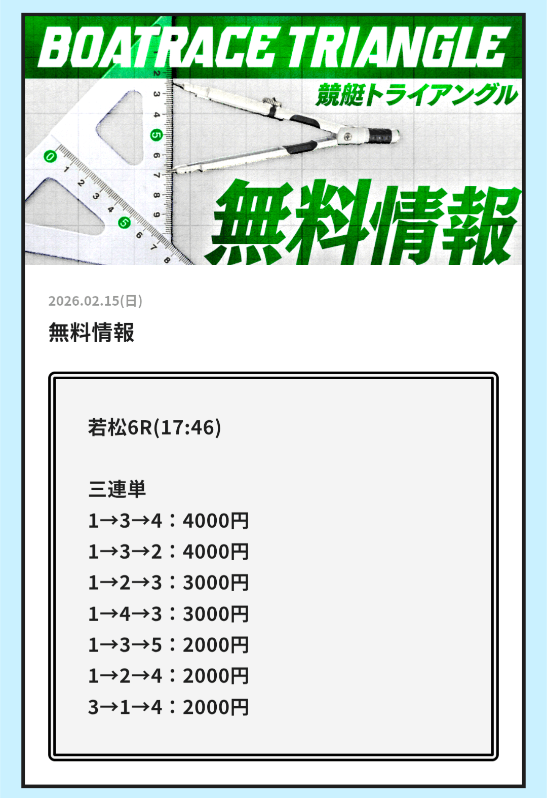 匿名今日の無料情報も良かった 朝に徳山レースで的中したと思ったら 夜の無料も若松レースで4万7400円の払い戻し出た投稿日:2026/02/20