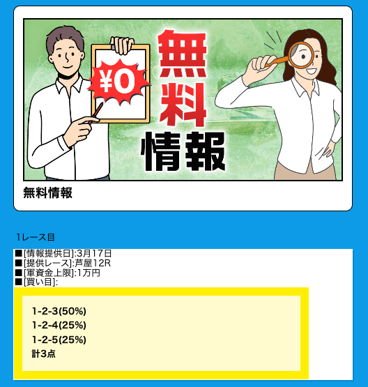 無料予想の実力は本物で、口コミも好評ばかりだったので・・・。