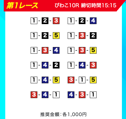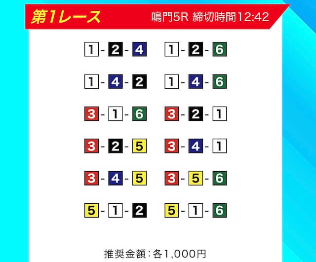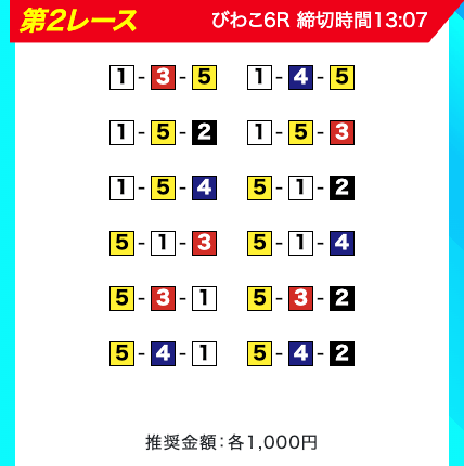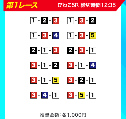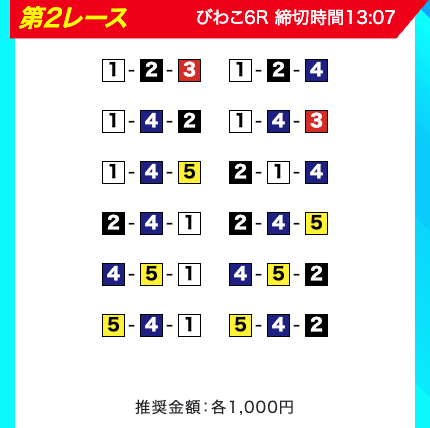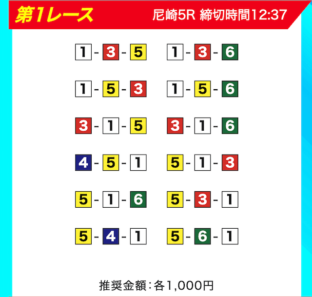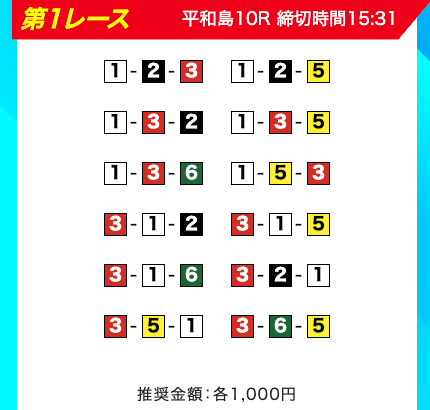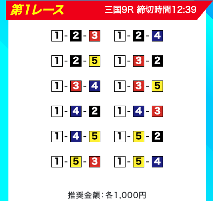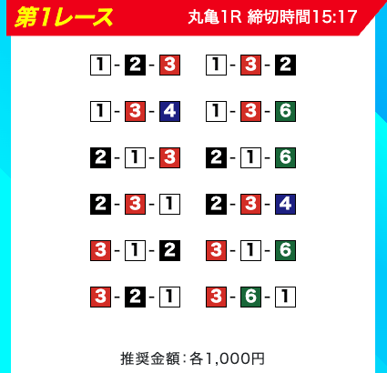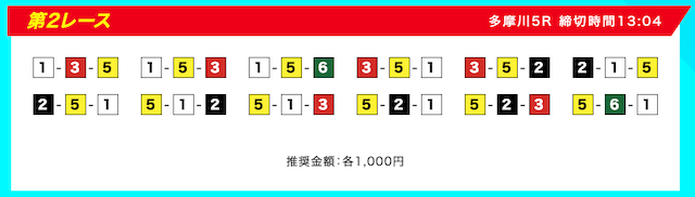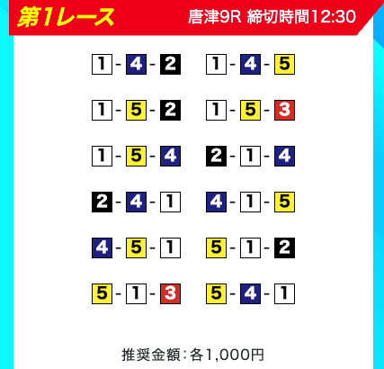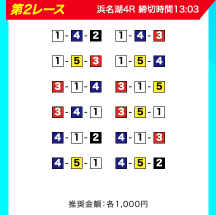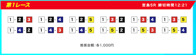 買い目は、①③-①③④-①③④⑤・④-①③-①③と、①③号艇を軸に④⑤号艇を絡める組み合わせ。
