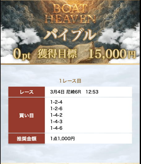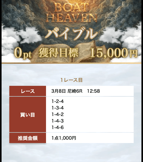 - 先月末から無料予想に参加して10万円のプラス!!基本的には10番人気以内の堅い決着だけど、人気艇を2軸で押さえるから、買い目点数が5点まで抑えられている。だから的中するだけで、回収率がグンと上がる。効率良く稼ぎたいなら「ボートヘブン」一択だと思います。投稿日:2025/07/20