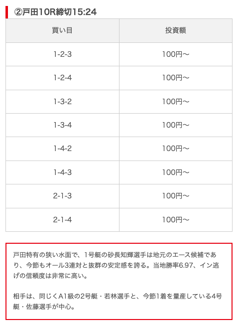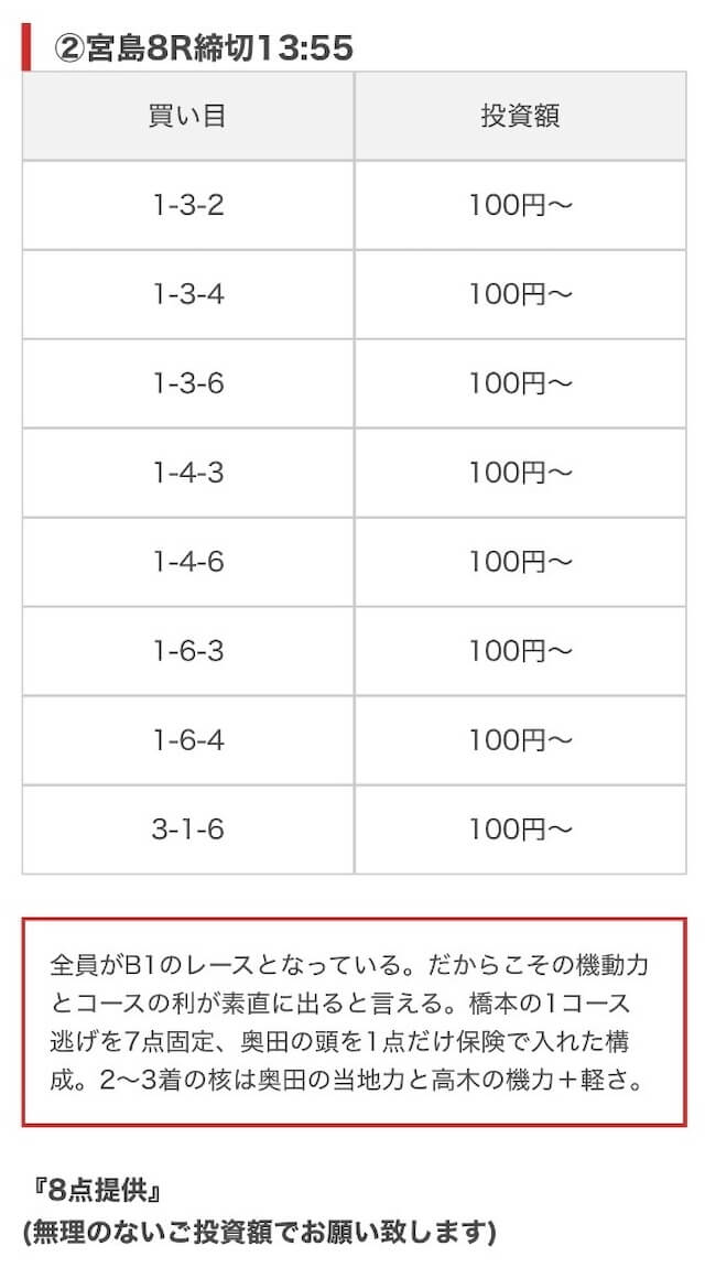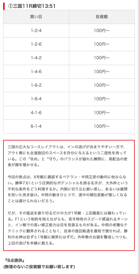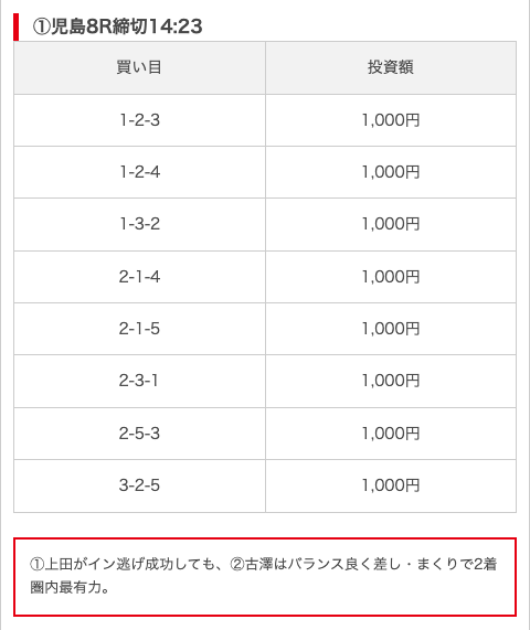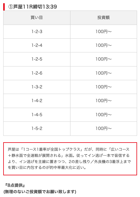 - 券種:3連単(8点)