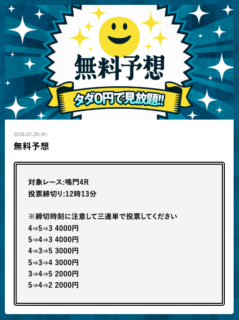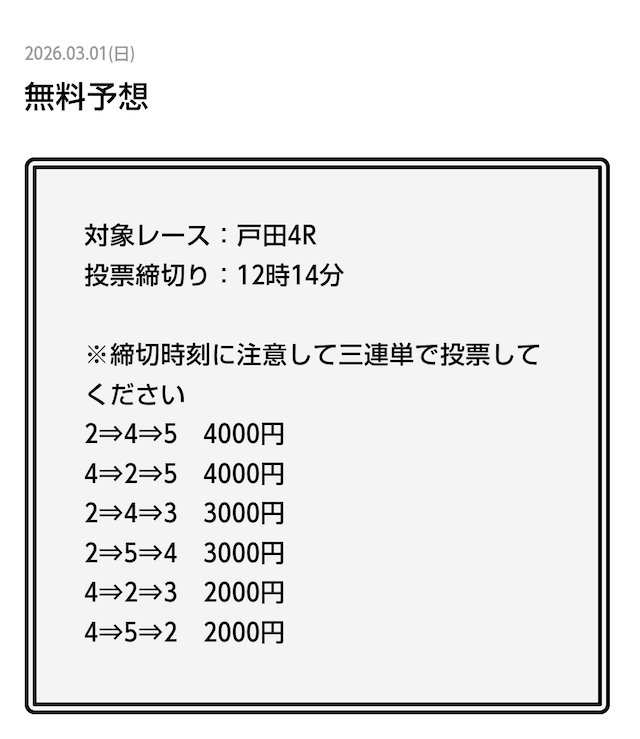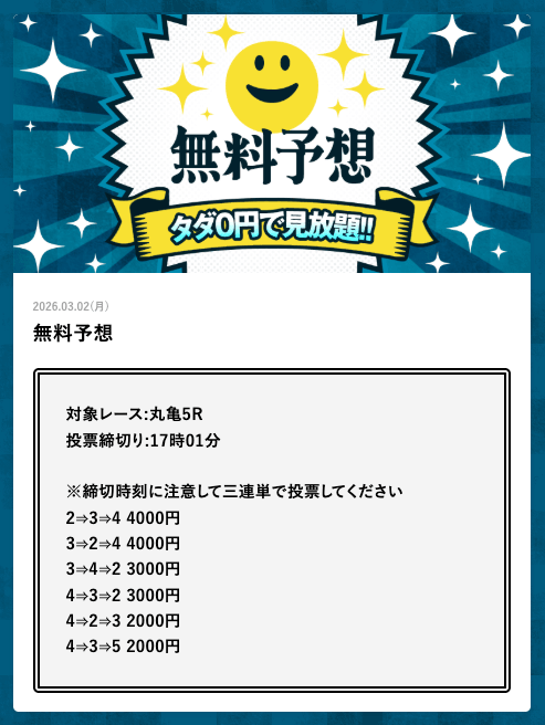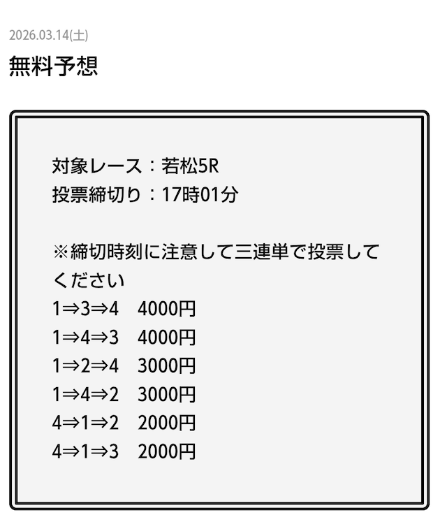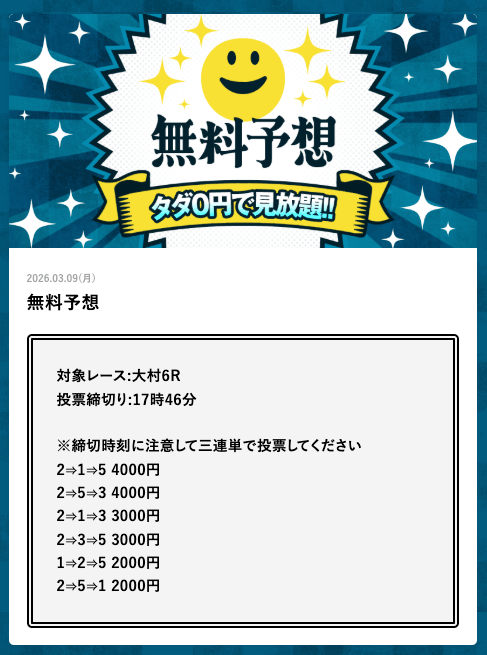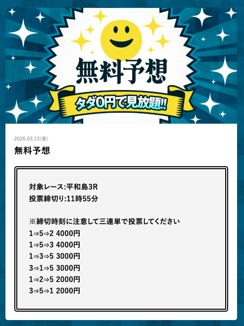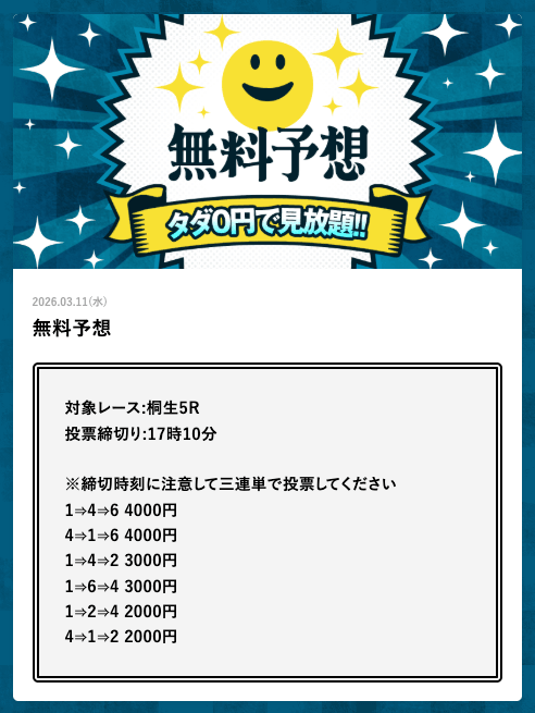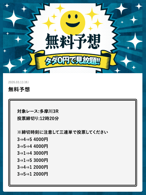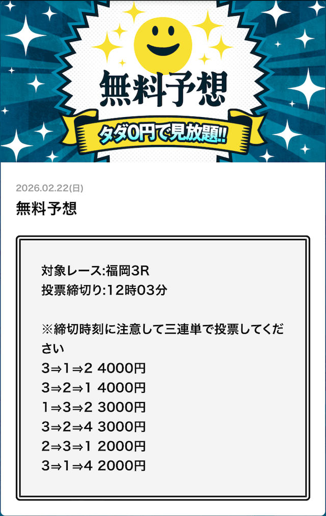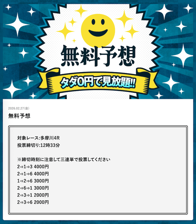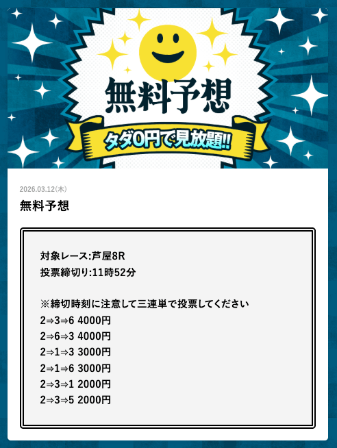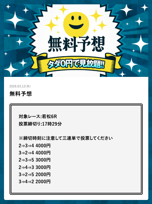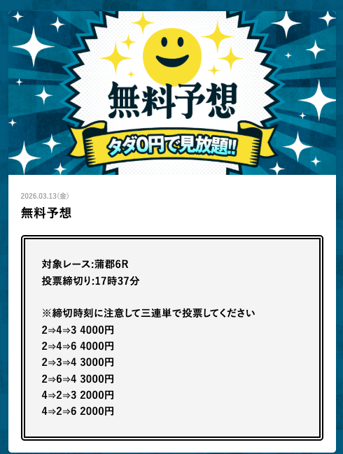 - 2026/03/14的中 無料予想で42,000円獲得2026/03/13的中 無料予想で18,000円獲得2026/03/13的中 無料予想で37,200円獲得2026/03/12的中 無料予想で60,800円獲得2026/03/09的中 無料予想で111,600円獲得2026/03/06的中 無料予想で20,600円獲得2026/03/01的中 無料予想で30,400円獲得2026/02/26的中 無料予想で28,600円獲得2026/02/21的中 無料予想で22,800円獲得2026/02/16的中 無料予想で23,200円獲得