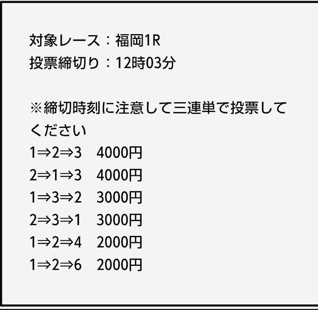 - 券種:3連単(6点)