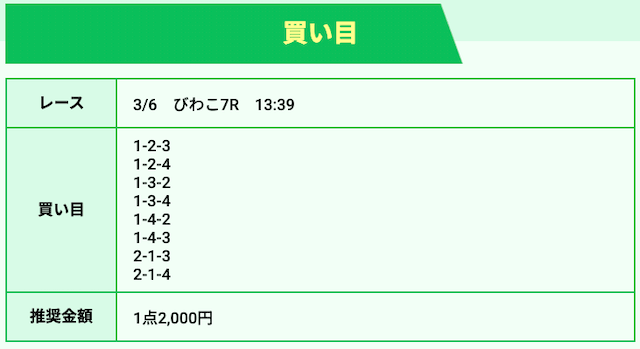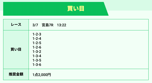 - 予想は当たるし稼げるんだけど、唯一の難点は公開時間と締め切り時間が近いこと。予想が公開されてから1時間足らずで締め切りが来てしまう、、、何回も予想を見そびれたことがあるから、公開時間には気をつけておかないとダメだね。投稿日:2024/01/26