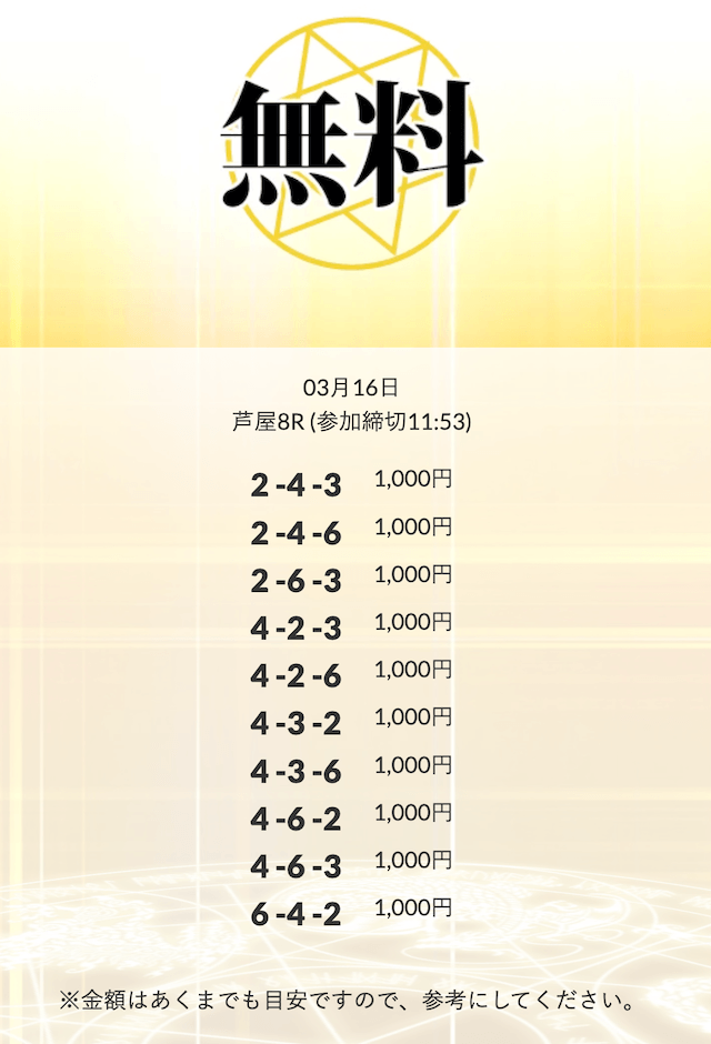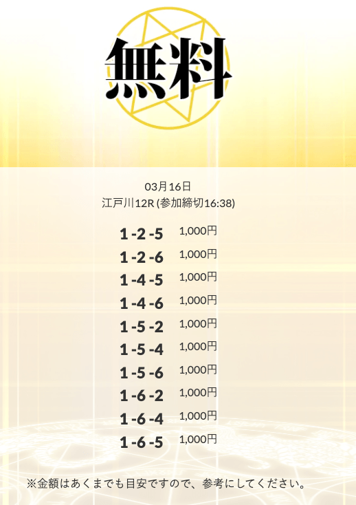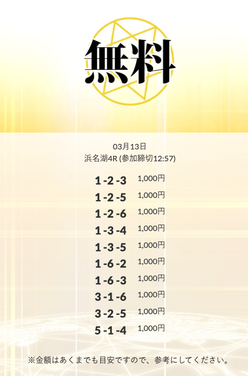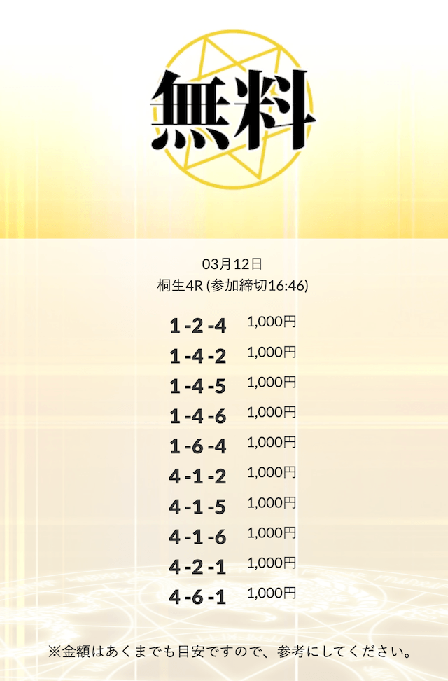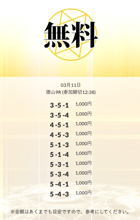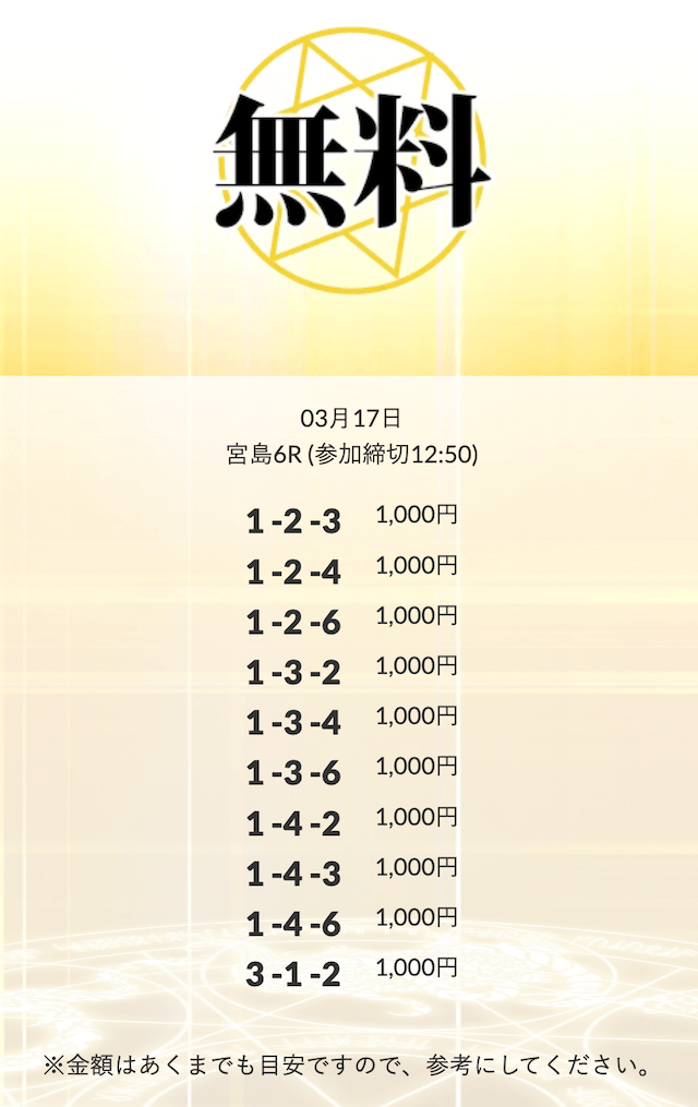 初回限定の「八咫烏」は、不的中だったら情報料金が丸ごと返ってくる保障付きらしい。つまり、リスクで見りゃ無料予想と変わんねぇな。逆に「VIPプラン」は情報料金に対しての旨みが見合ってねぇ⋯。資金効率を踏まえると「剣」「青龍」「朱雀」…このあたりを狙うのが賢いな。