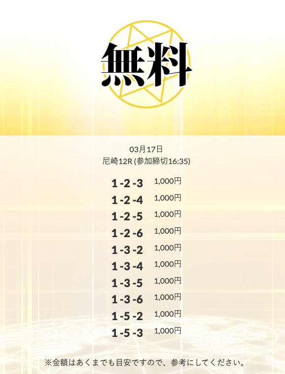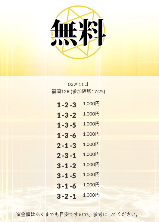- 2026/03/18的中 無料予想で32,700円獲得2026/03/10的中 無料予想で16,500円獲得2026/03/09的中 無料予想で33,100円獲得2026/03/05的中 無料予想で17,300円獲得2026/03/05的中 無料予想で23,000円獲得2026/03/04的中 無料予想で12,800円獲得2026/03/02的中 無料予想で20,000円獲得2026/02/28的中 無料予想で18,700円獲得2026/02/22的中 無料予想で11,400円獲得2026/02/21的中 無料予想で15,800円獲得