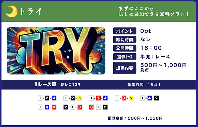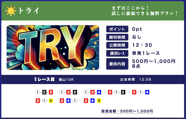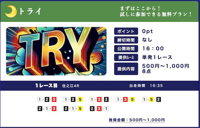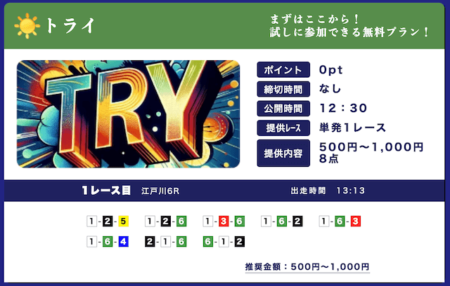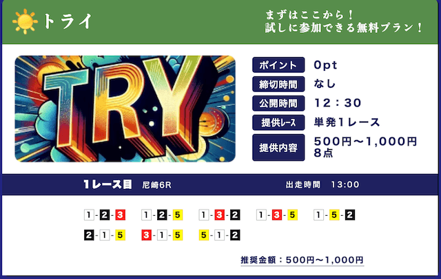 - 低リスクで試せる無料予想が入口になって、自然と有料プランに移行できたのが良かったです。しかも有料予想も結構安いし、無料予想の精度を見る限り、そこまでリスクを感じなかったな。初心者の方はオススメです。投稿日:2025/09/15