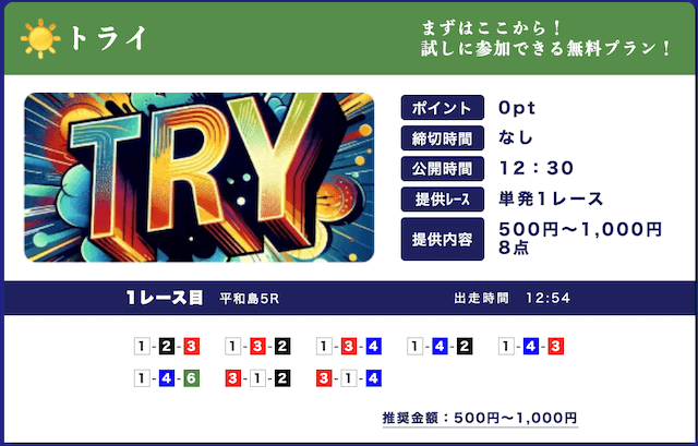 競艇大好き人間低リスクで試せる無料予想が入口になって、自然と有料プランに移行できたのが良かったです。しかも有料予想も結構安いし、無料予想の精度を見る限り、そこまでリスクを感じなかったな。初心者の方はオススメです。投稿日:2025/09/15
