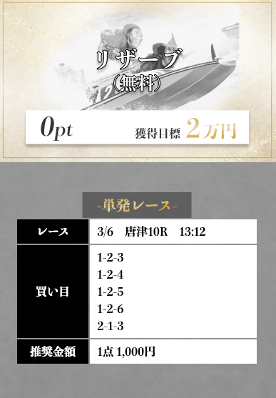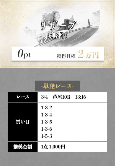 | 2025/3/18 1つ星 情報料金+舟券代 100,000円+20,000円 |