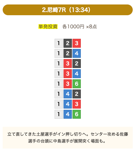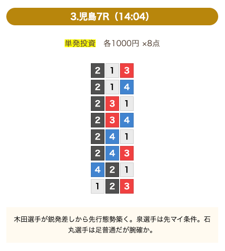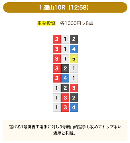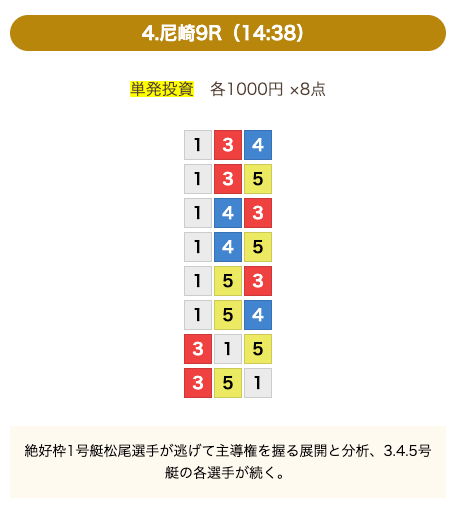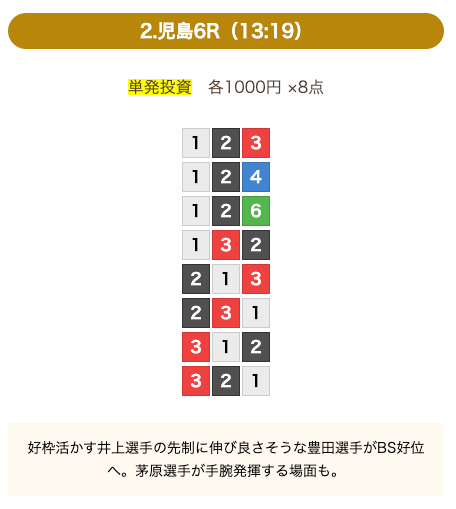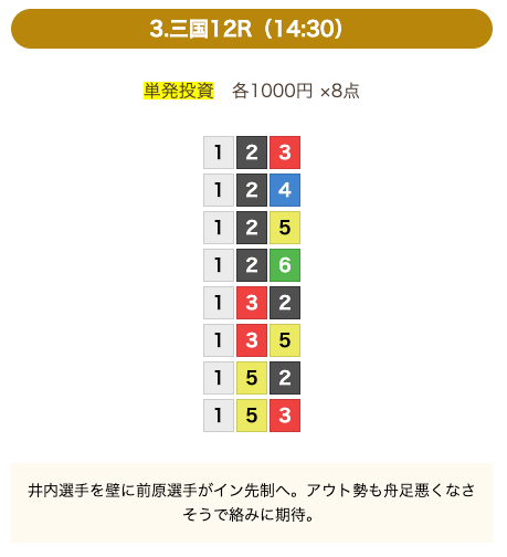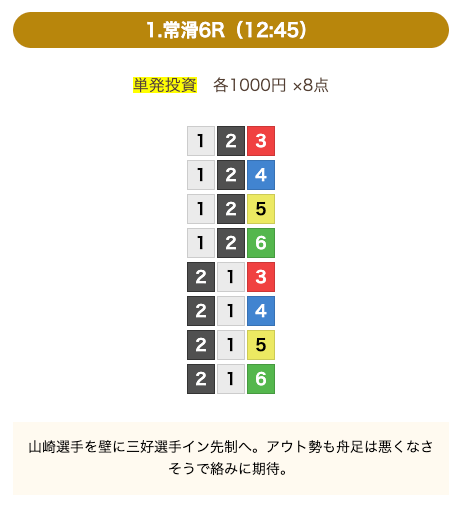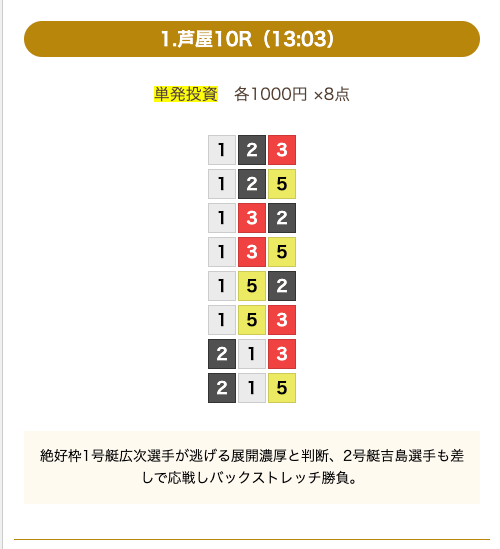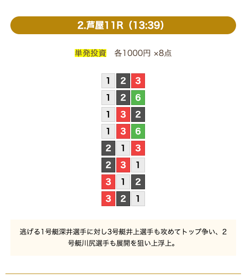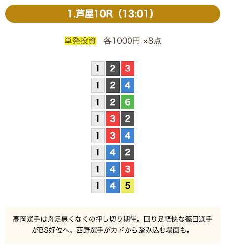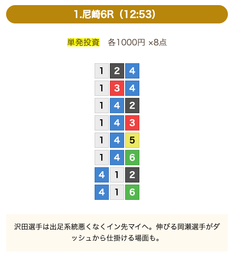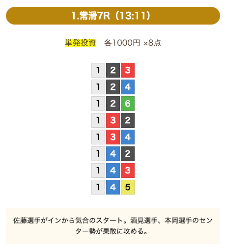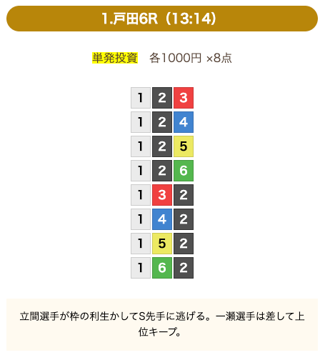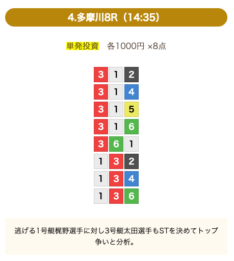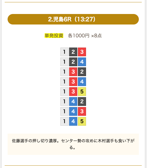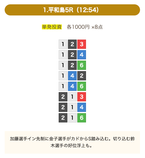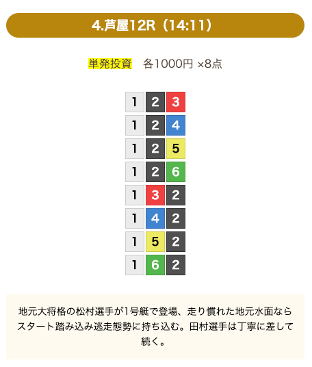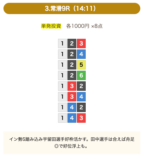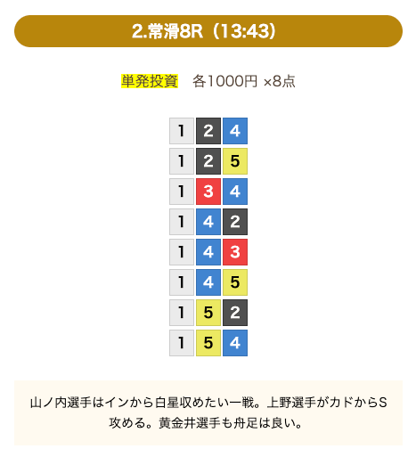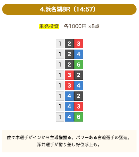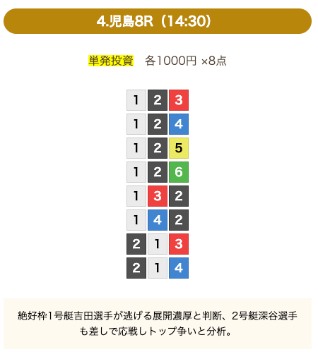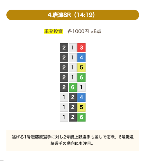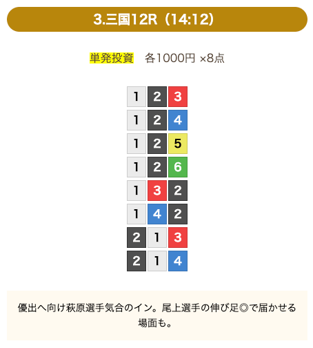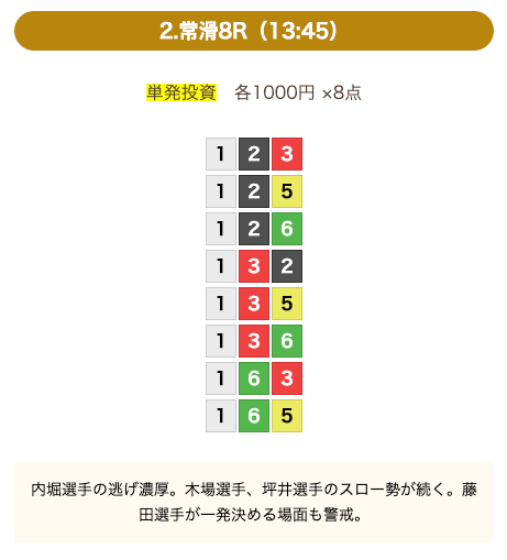 - 券種:3連単(8点)
