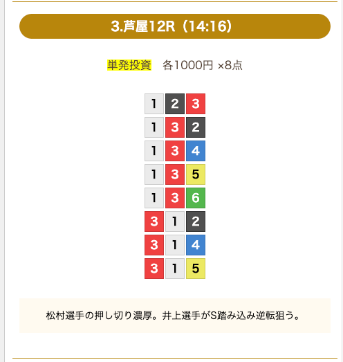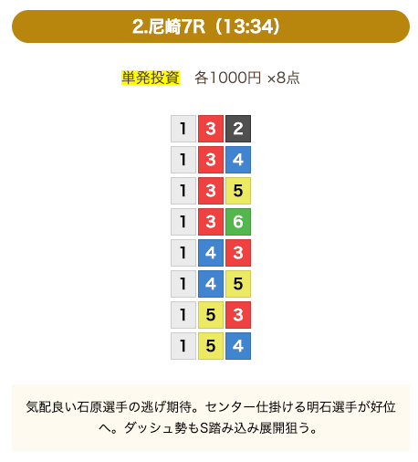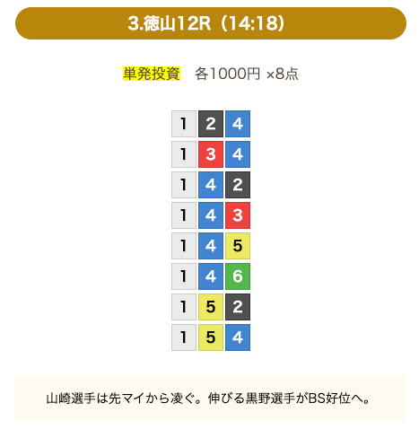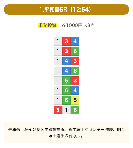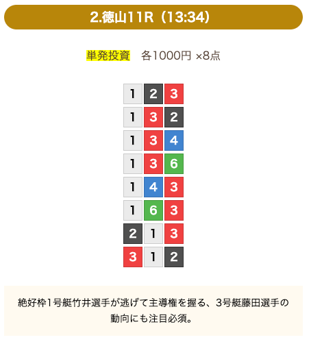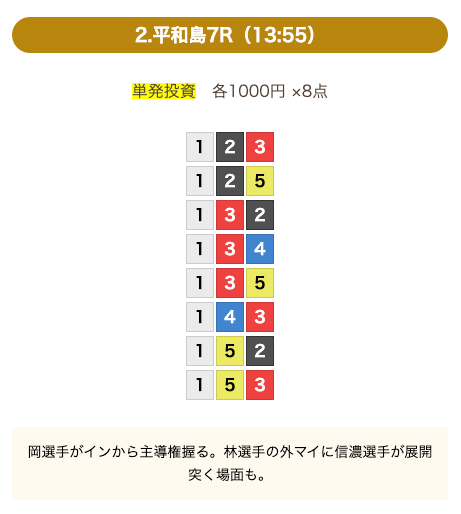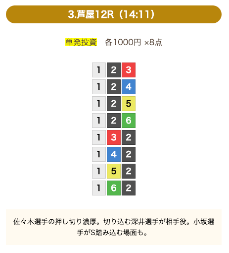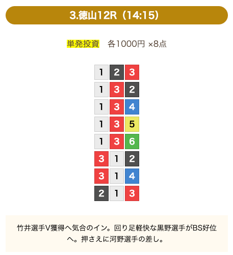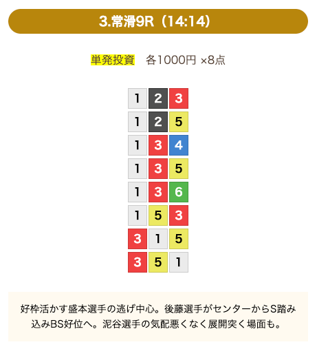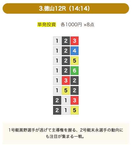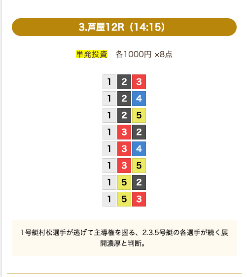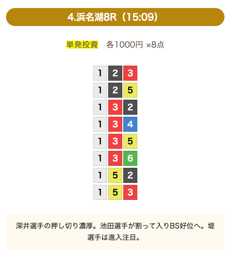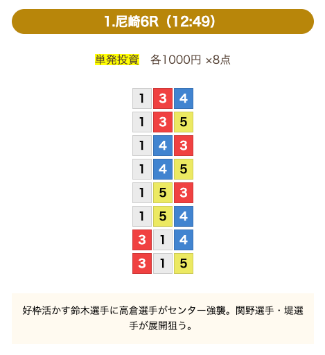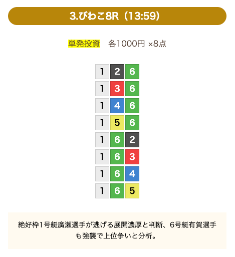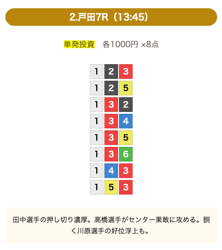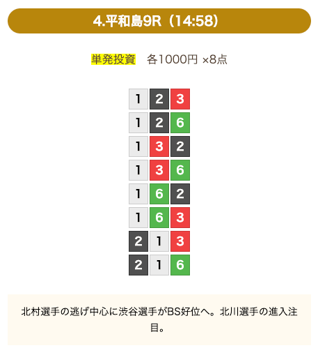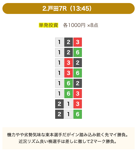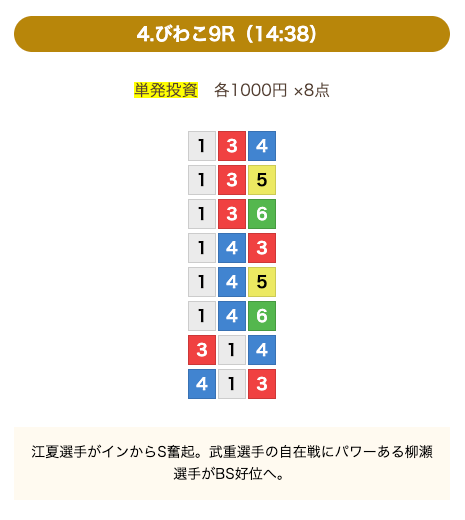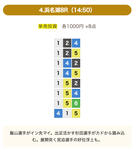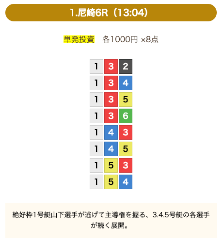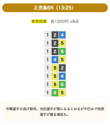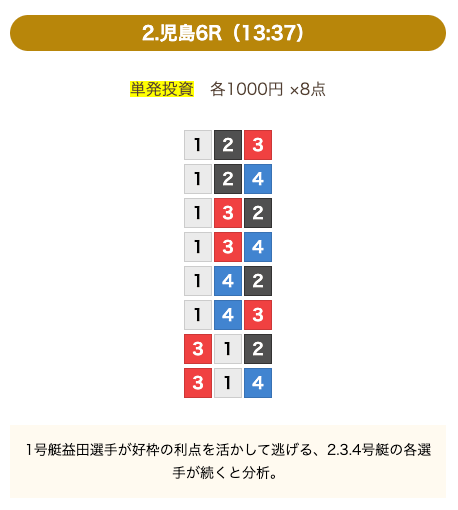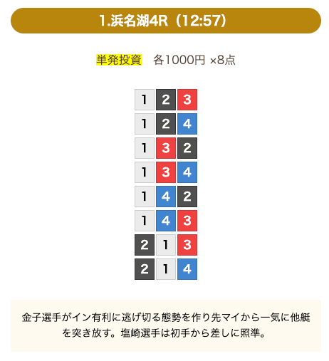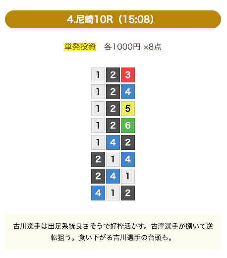 - 券種:3連単(8点)