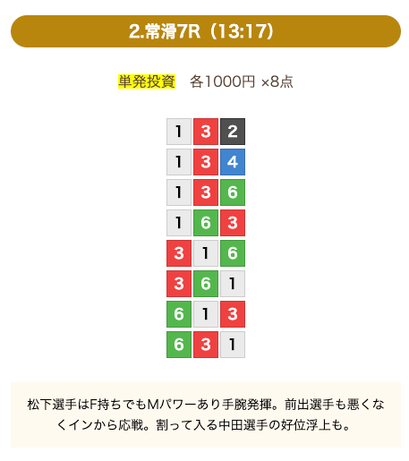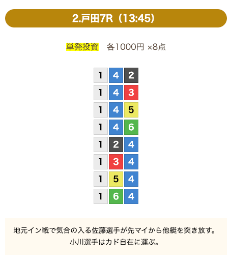 - 推奨舟券代:8,000円(1点1,000円)