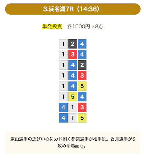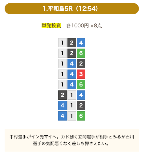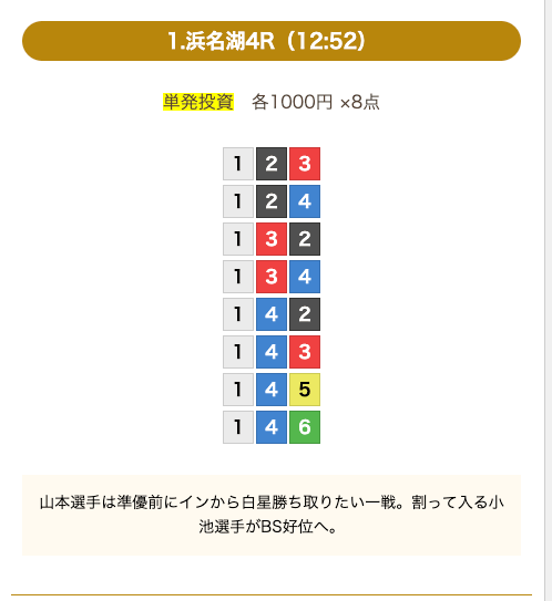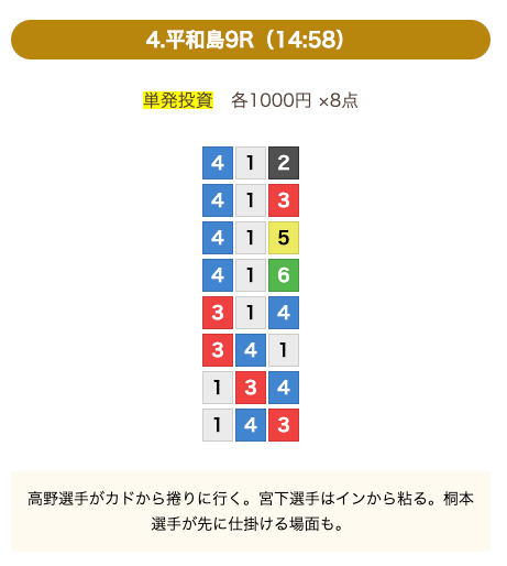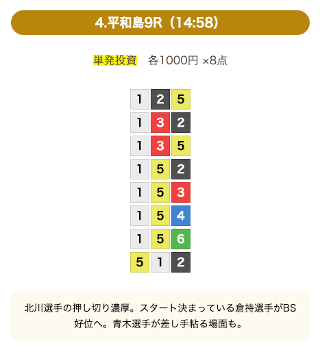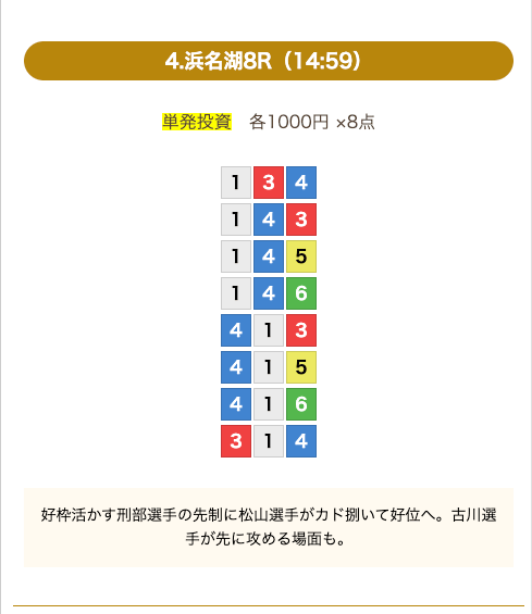 ①号艇を中心にした買い目で、④号艇を頭にした組み合わせも1点あります。