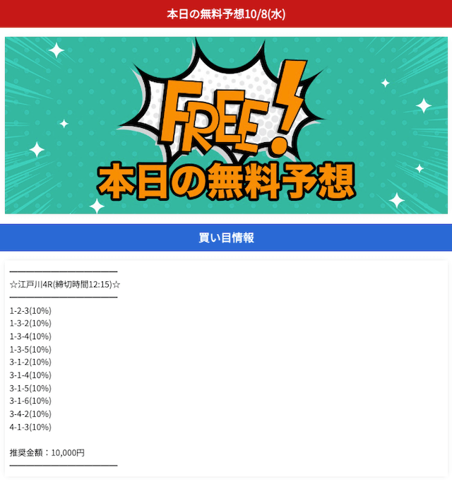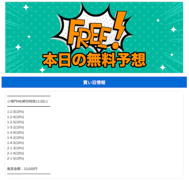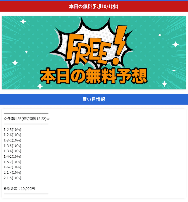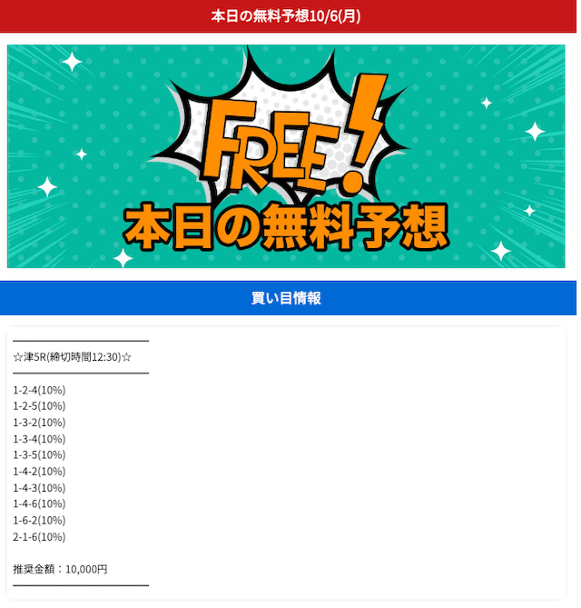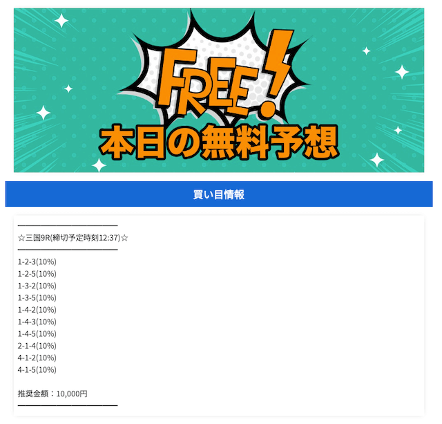 | 無料予想の口コミ | 無料予想における口コミの★評価 | 1.0点 |