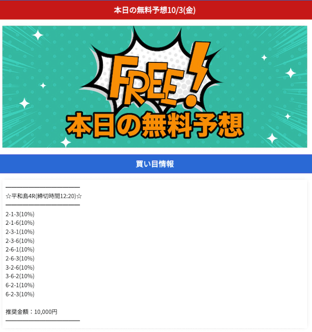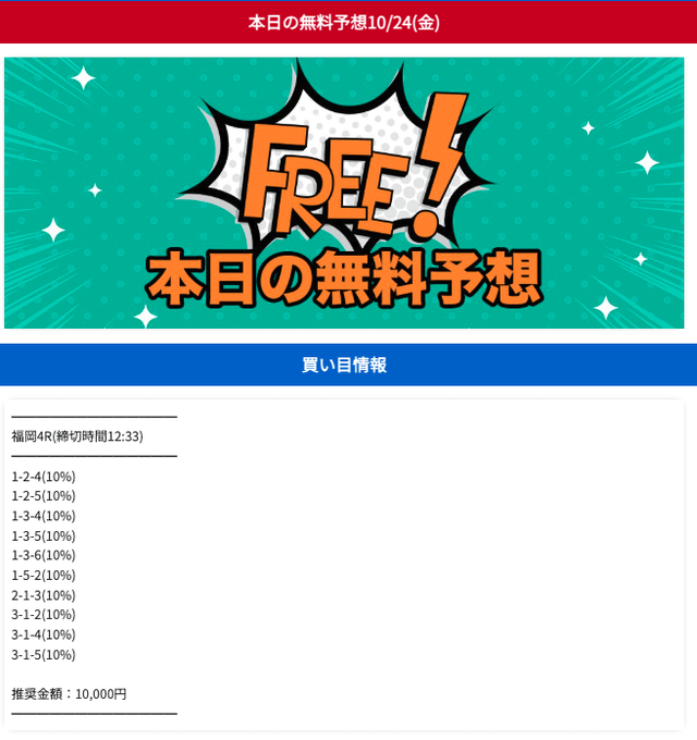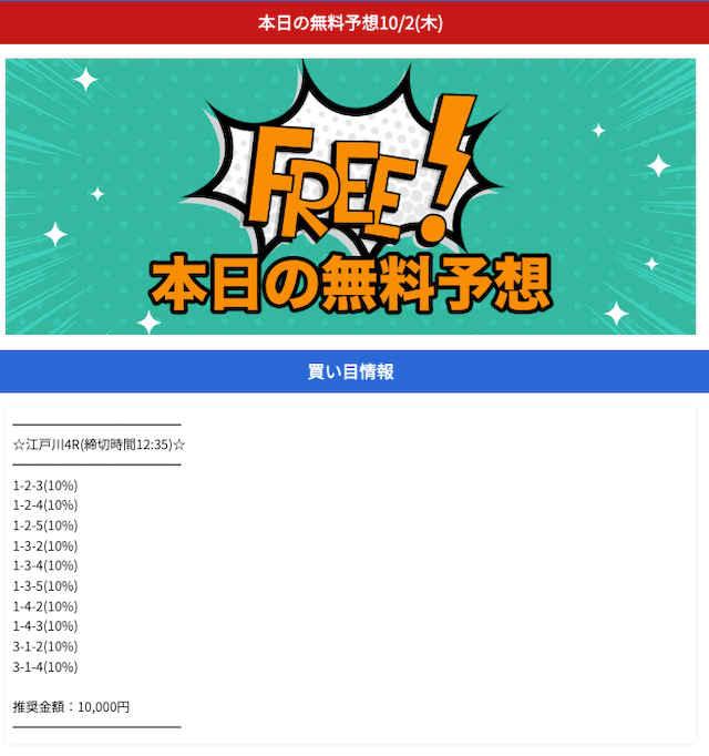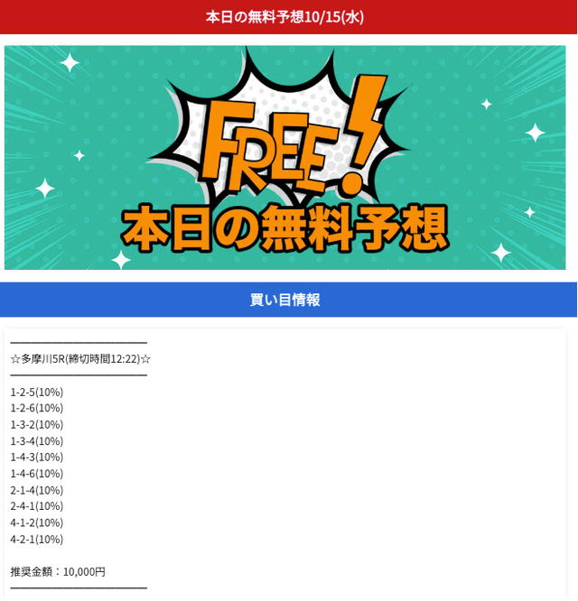 - 無料予想が当たらないときは本当にかすりもしない。連勝してたかと思えば急に外れまくるから、安定感には欠けるかな…。投稿日:2025/03/02