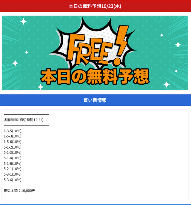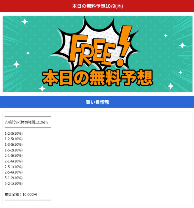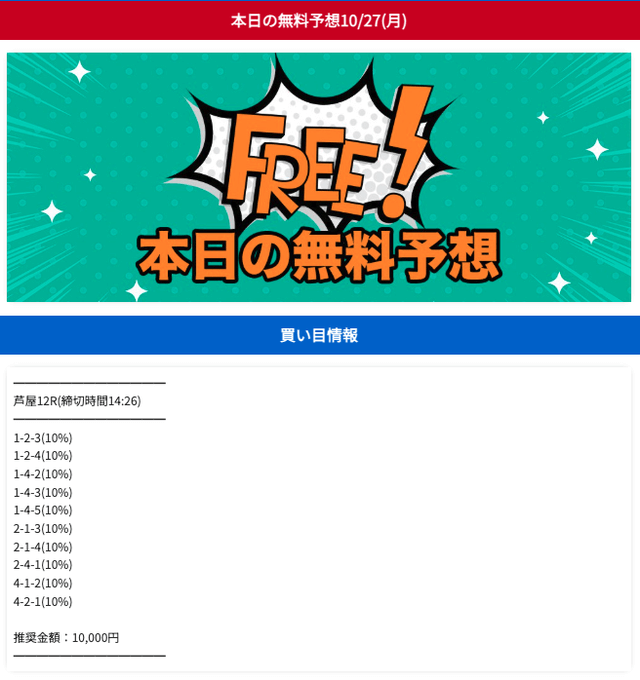 - 2025/10/27的中 無料予想で19,600円獲得2025/10/22的中 無料予想で19,900円獲得2025/10/15的中 無料予想で28,600円獲得2025/10/02的中 無料予想で15,400円獲得2025/09/26的中 無料予想で16,900円獲得2025/09/23的中 無料予想で15,600円獲得2025/09/17的中 無料予想で18,400円獲得2025/09/15的中 無料予想で18,200円獲得2025/09/05的中 無料予想で22,100円獲得2025/08/27的中 無料予想で27,300円獲得