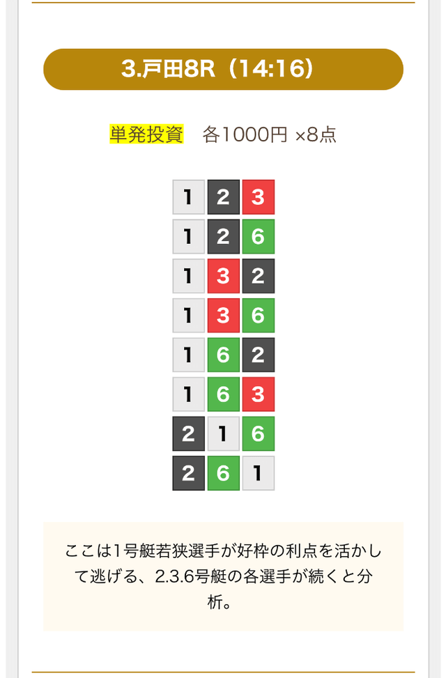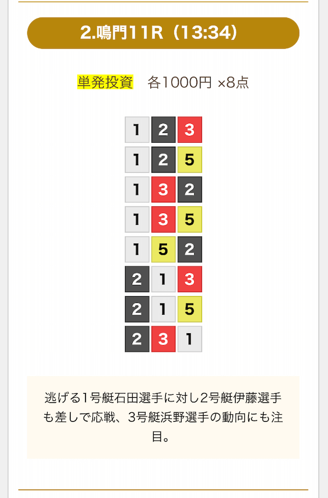 - 連勝しだすと本当に止まらない!調子が良いときは絶対に参加しておくべきだよ〜。競艇ストロングの無料予想一本で稼いでいきたいなら1点あたりの投資金を増やすorコロガシで勝負するのが最適かも。俺は自分の予想の保険代わりとして1点1,500円で参加している感じだね。自分の予想が外れてもストロングが当たるからいつも助けられているよ(笑)投稿日:2023/03/16
