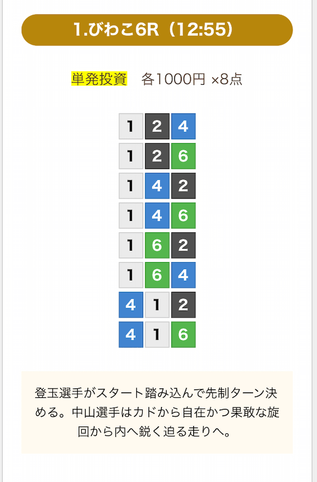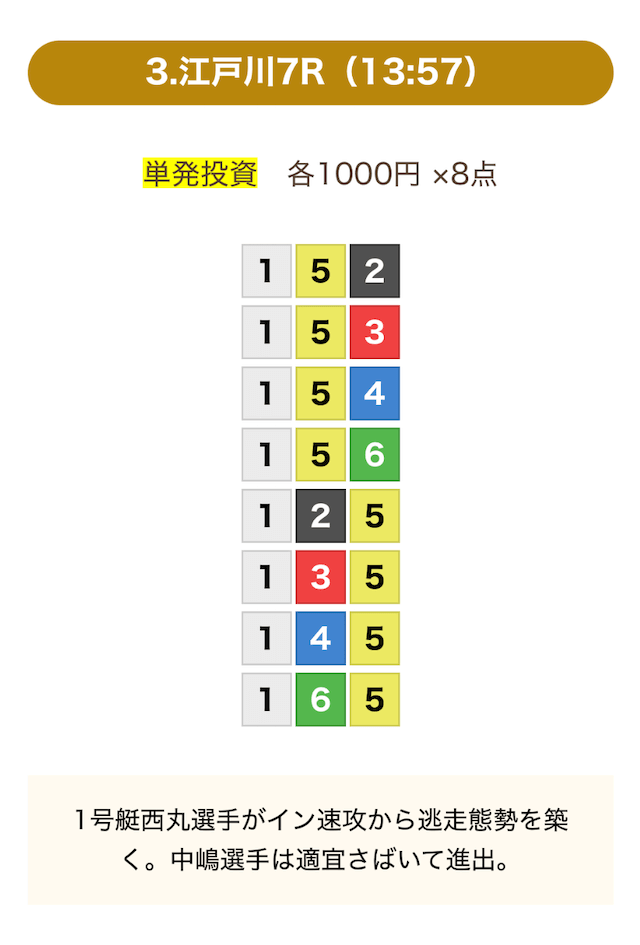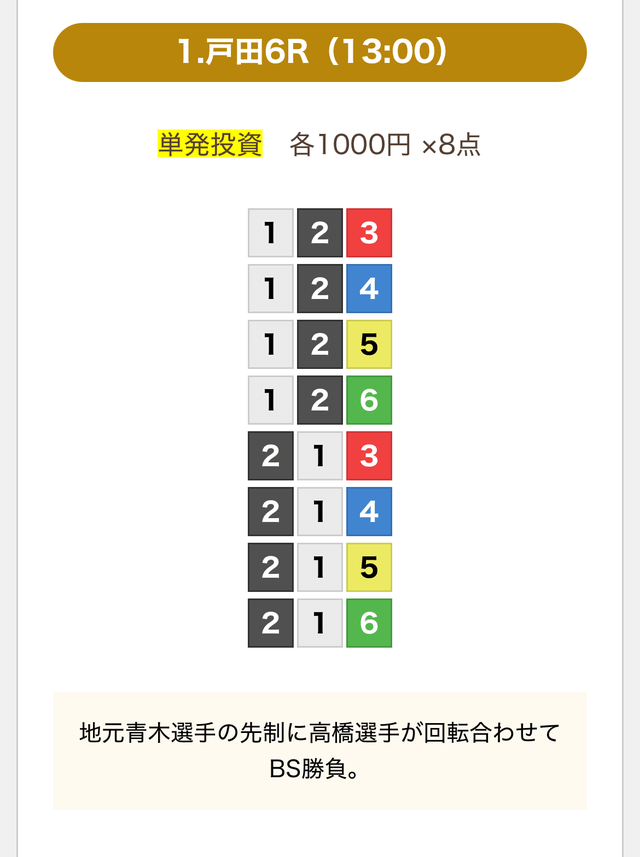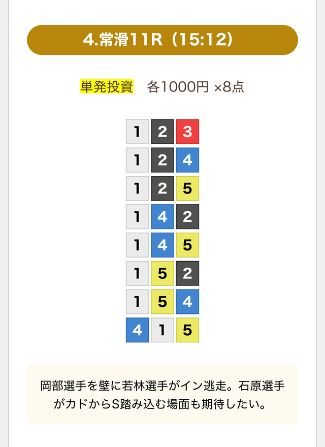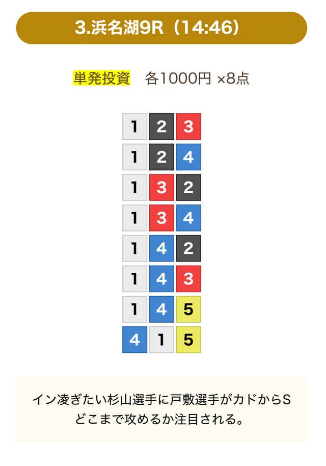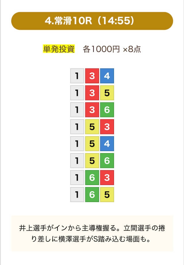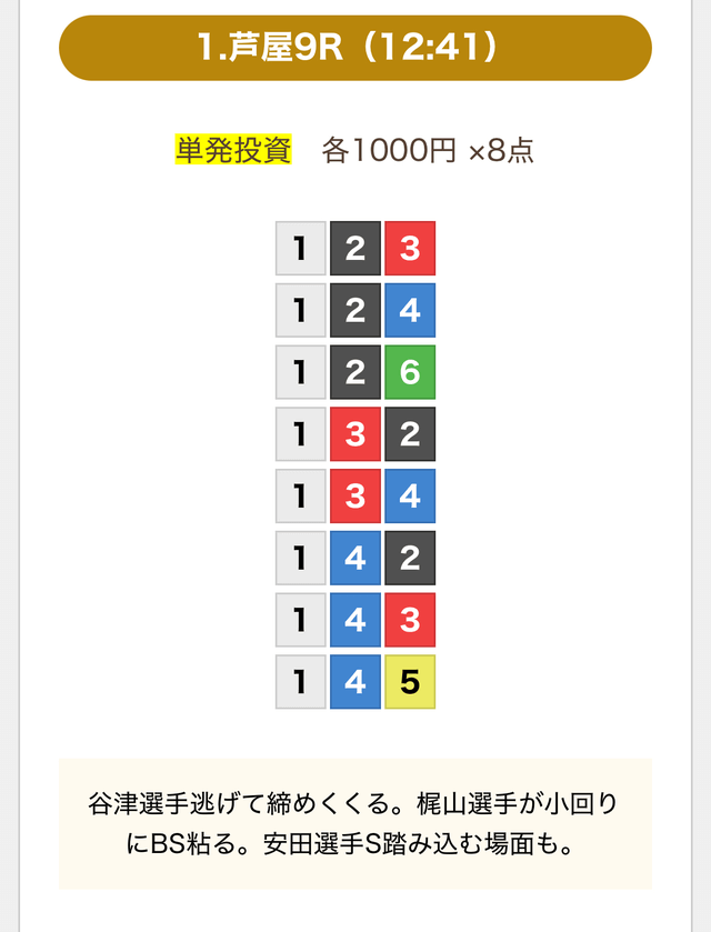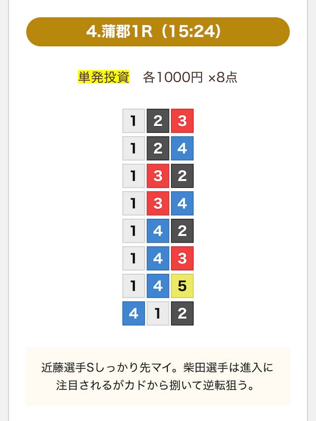 ①号艇とA級を軸にしつつ、相手は幅広く押さえてやがる。ヒモ荒れして時折50倍超えのオッズを拾ってくるから侮れねぇんだよな⋯。