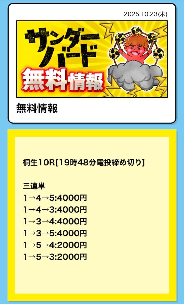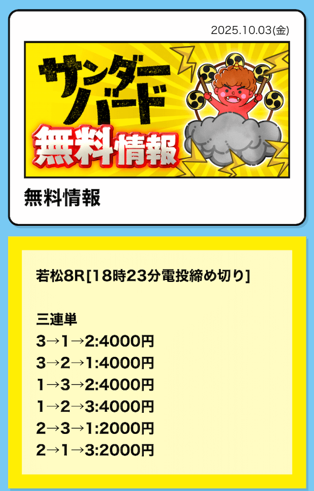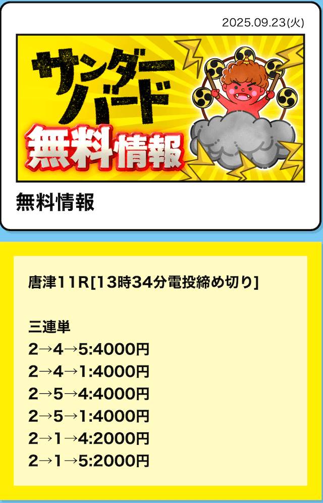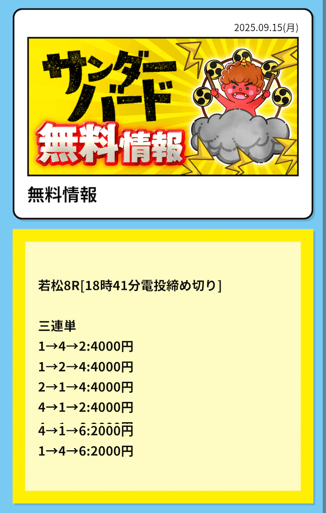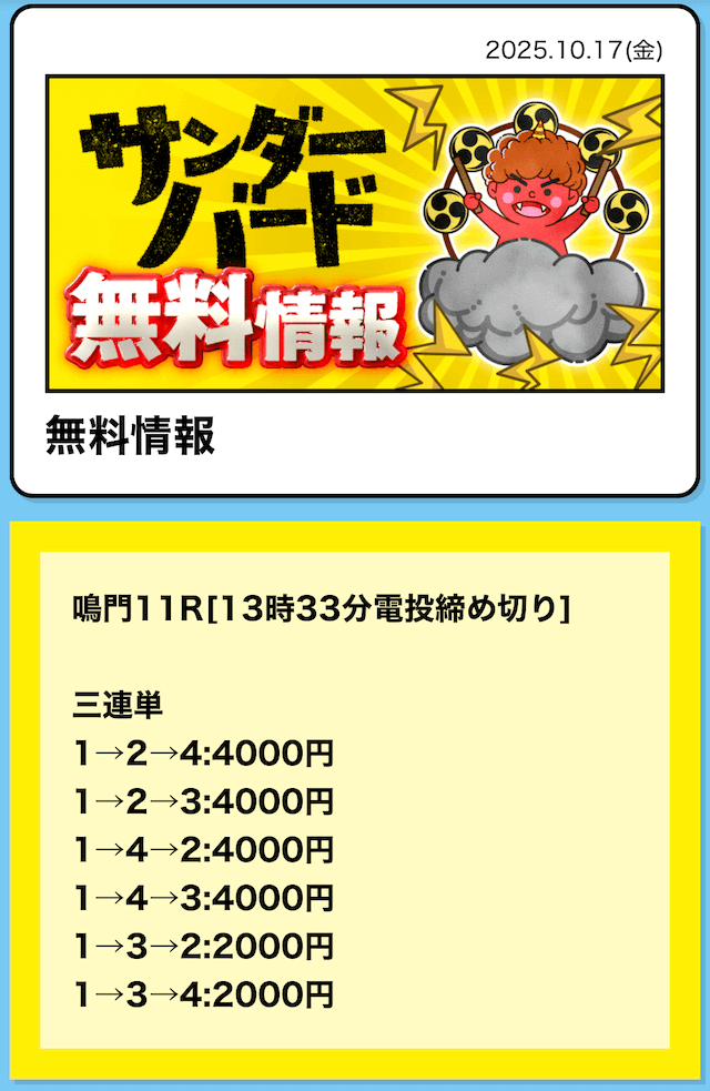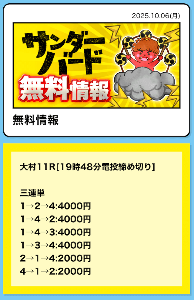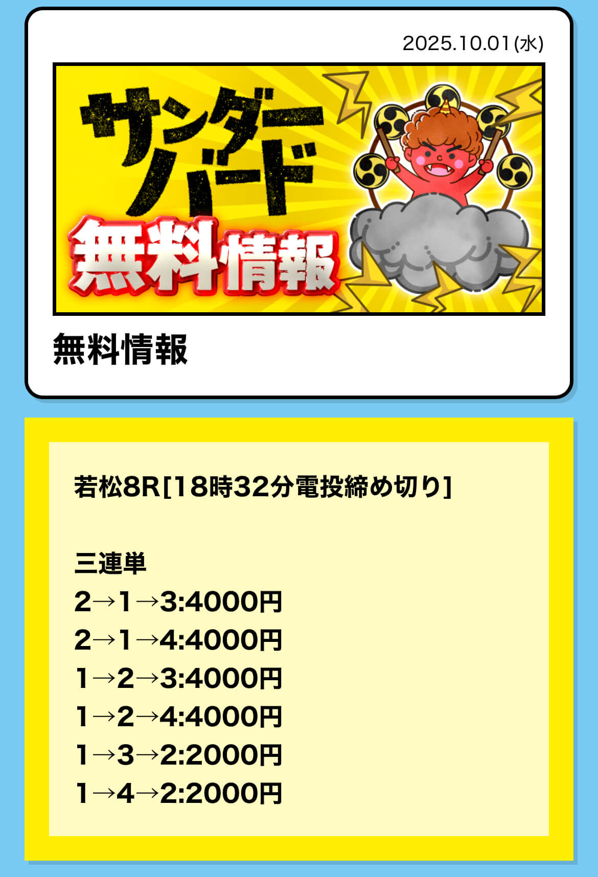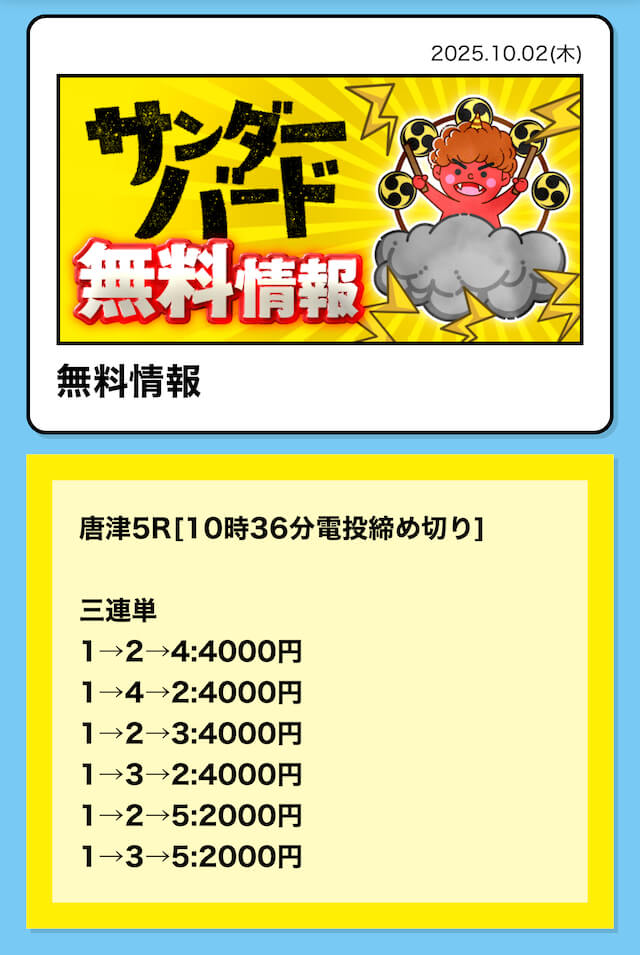 - 2025/10/23的中 無料予想で72,400円獲得2025/10/20的中 無料予想で24,800円獲得2025/10/17的中 無料予想で30,800円獲得2025/10/16的中 無料予想で21,600円獲得2025/10/15的中 無料予想で90,400円獲得2025/10/09的中 無料予想で34,400円獲得2025/10/09的中 無料予想で30,000円獲得2025/10/03的中 無料予想で63,200円獲得2025/09/29的中 無料予想で29,200円獲得2025/09/26的中 無料予想で24,400円獲得