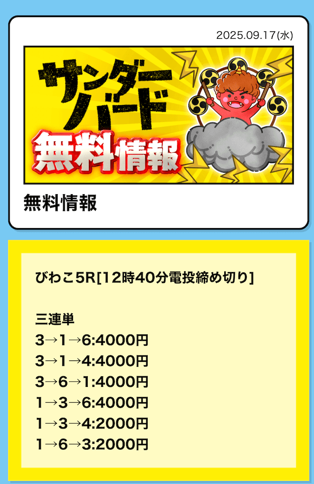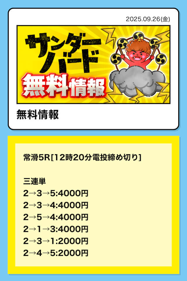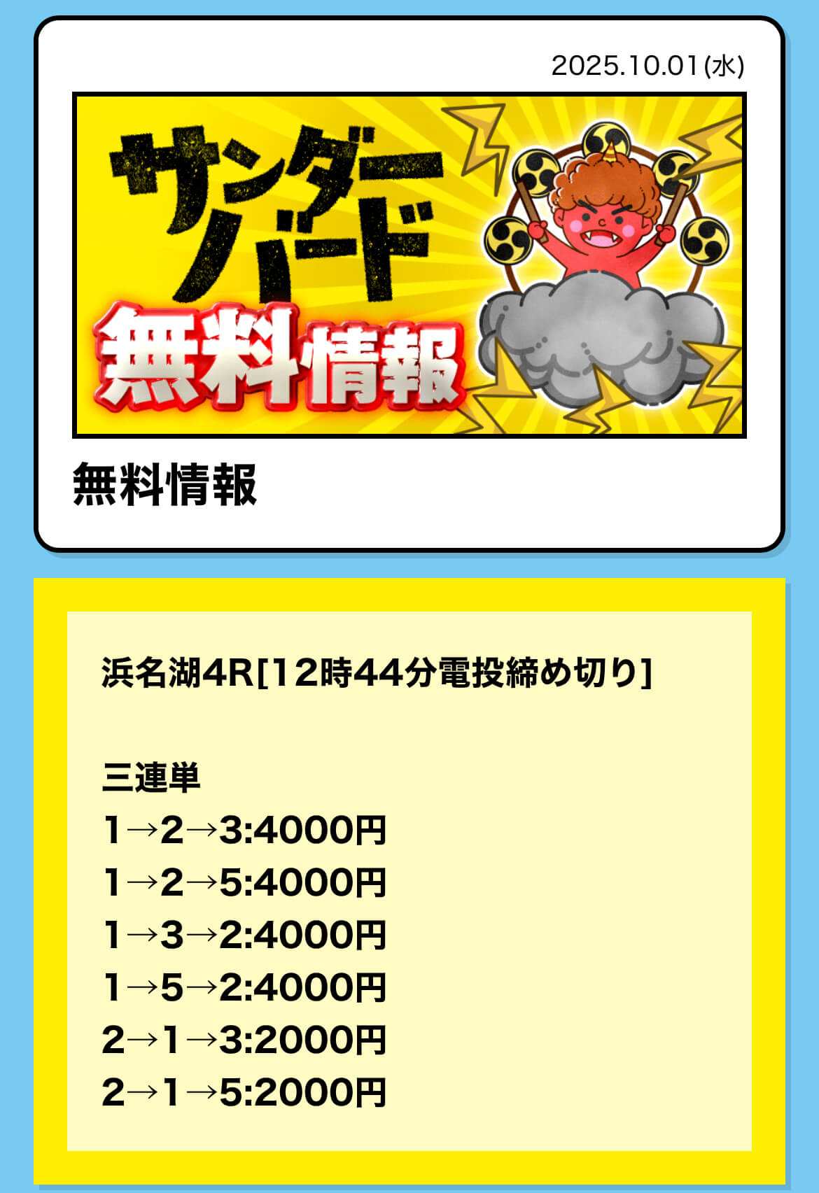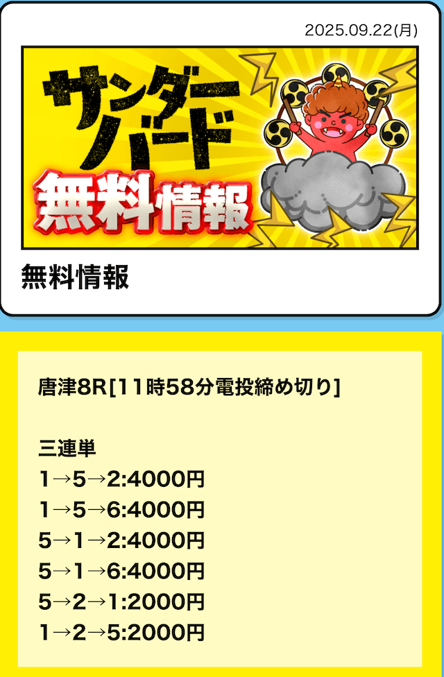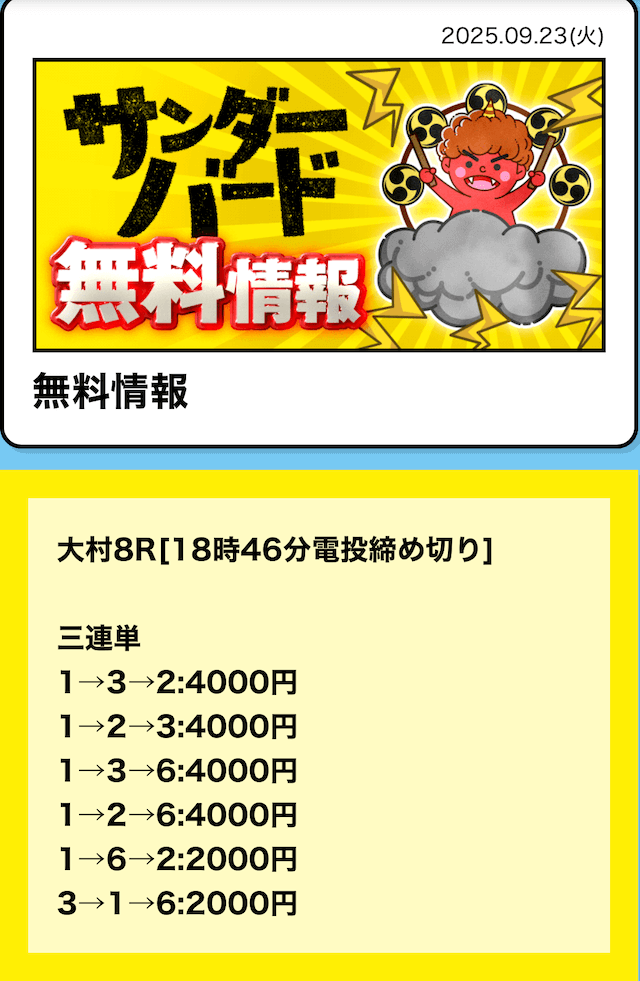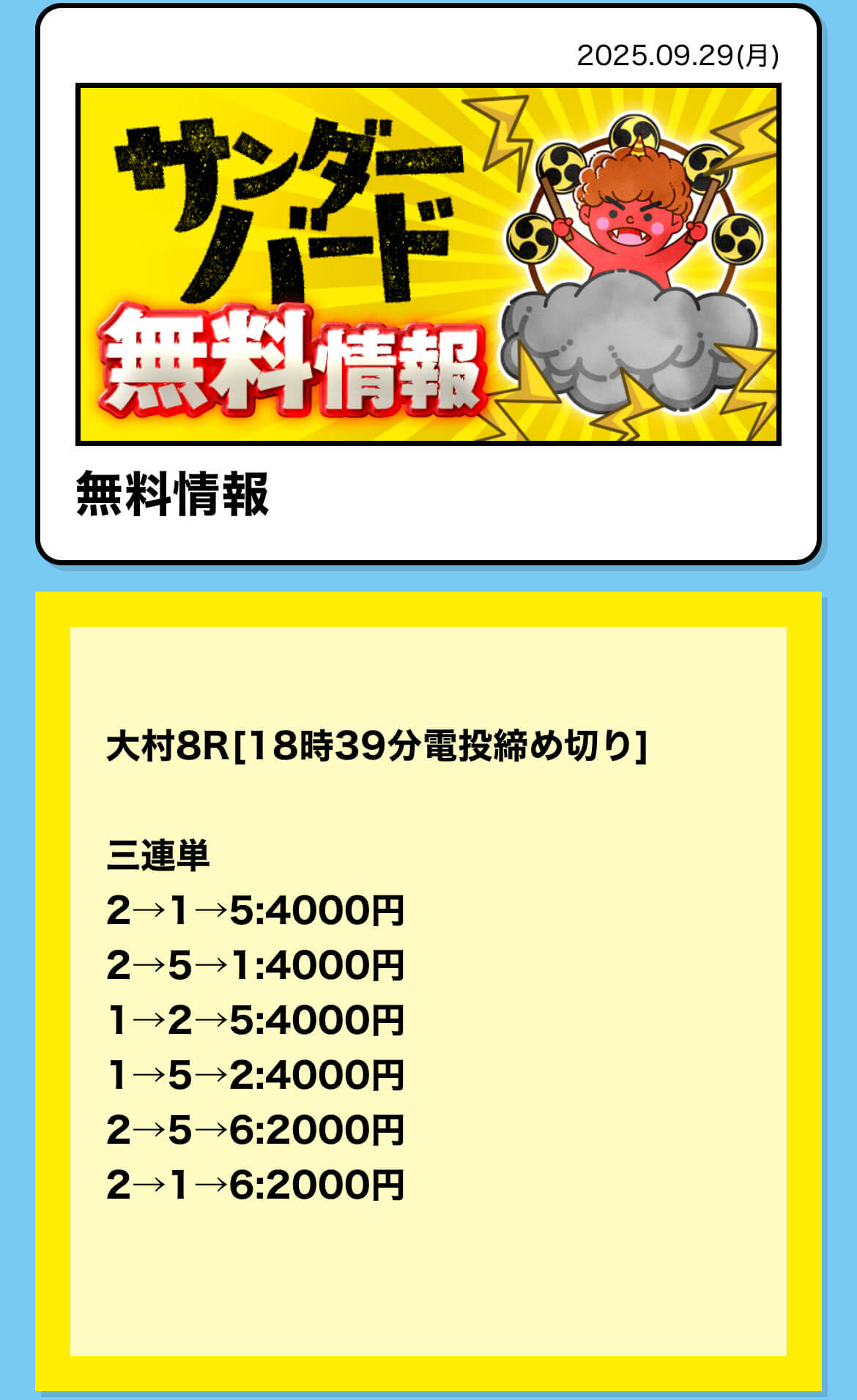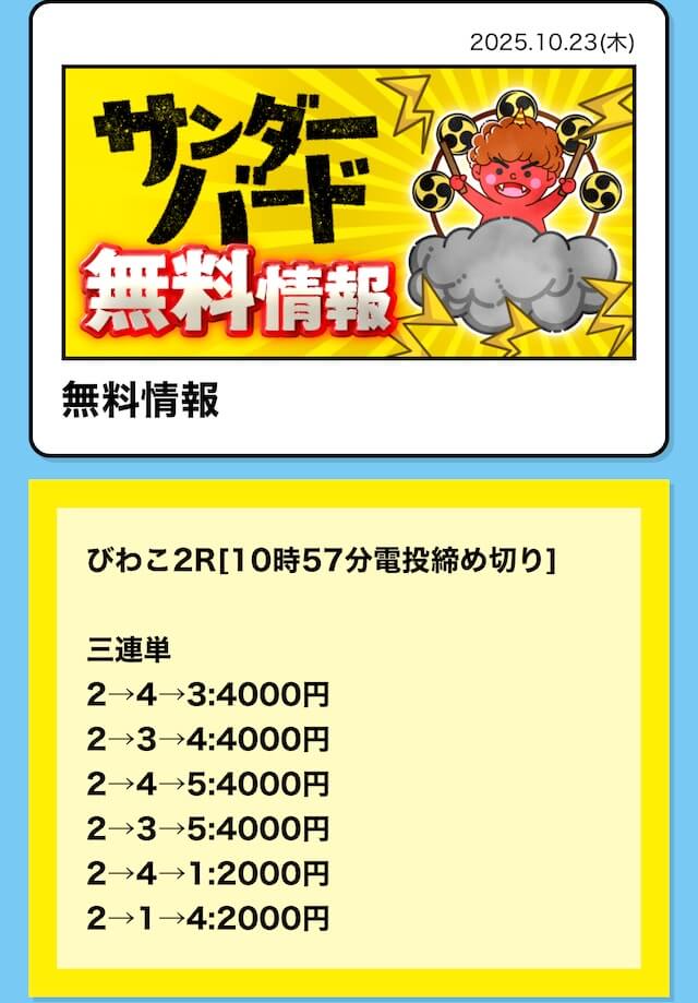 - 2025/10/23的中 無料予想で72,400円獲得2025/10/20的中 無料予想で24,800円獲得2025/10/17的中 無料予想で30,800円獲得2025/10/16的中 無料予想で21,600円獲得2025/10/15的中 無料予想で90,400円獲得2025/10/09的中 無料予想で34,400円獲得2025/10/09的中 無料予想で30,000円獲得2025/10/03的中 無料予想で63,200円獲得2025/09/29的中 無料予想で29,200円獲得2025/09/26的中 無料予想で24,400円獲得
