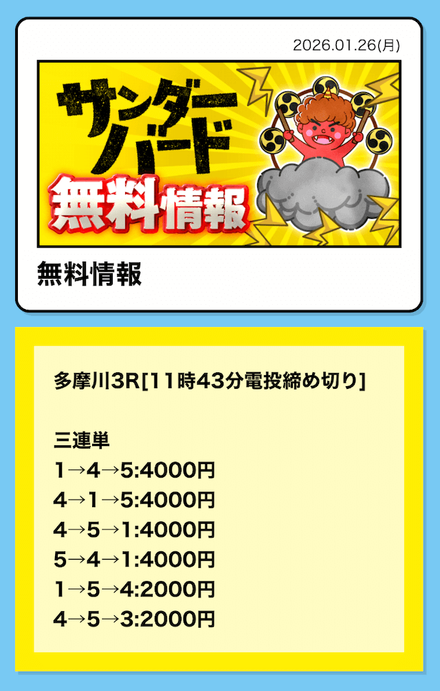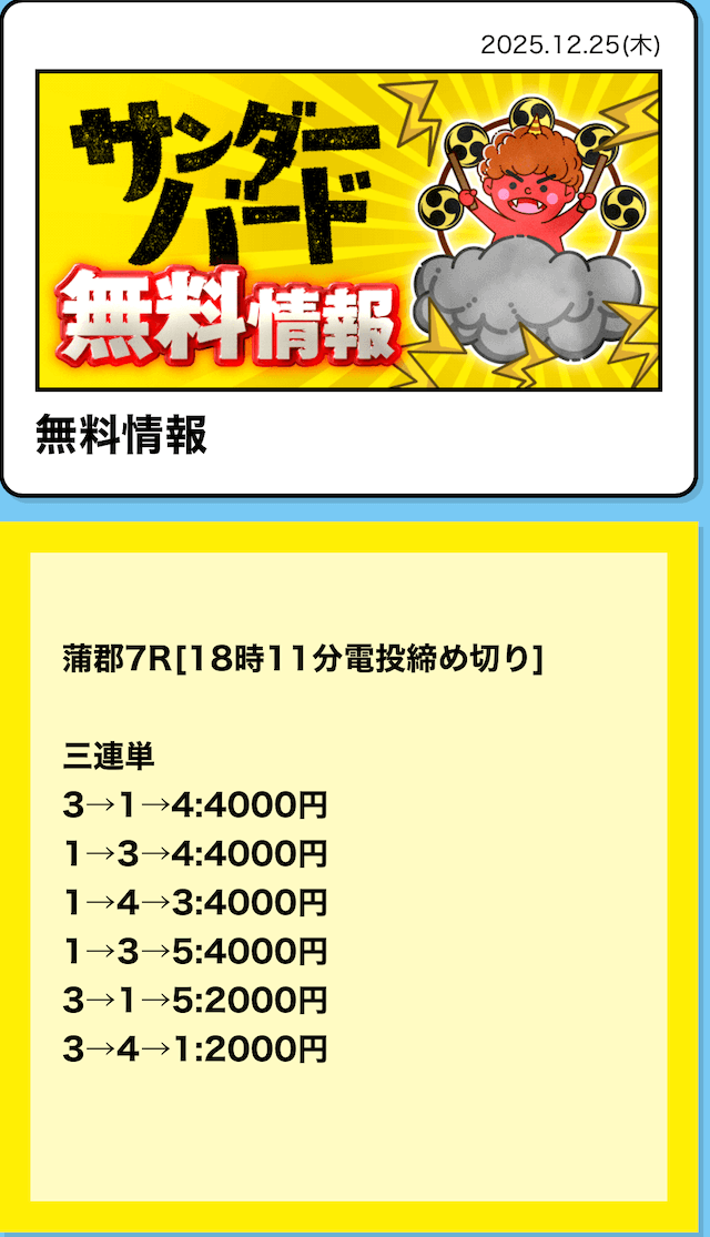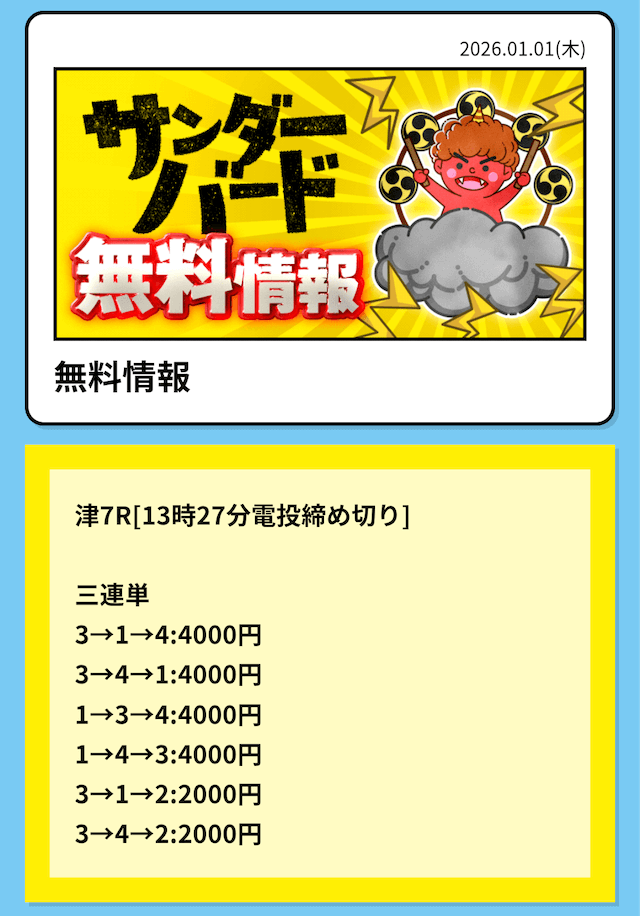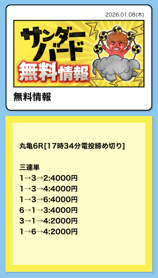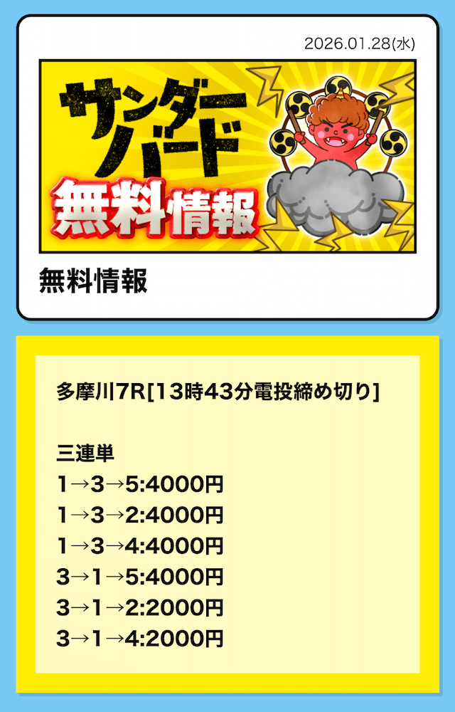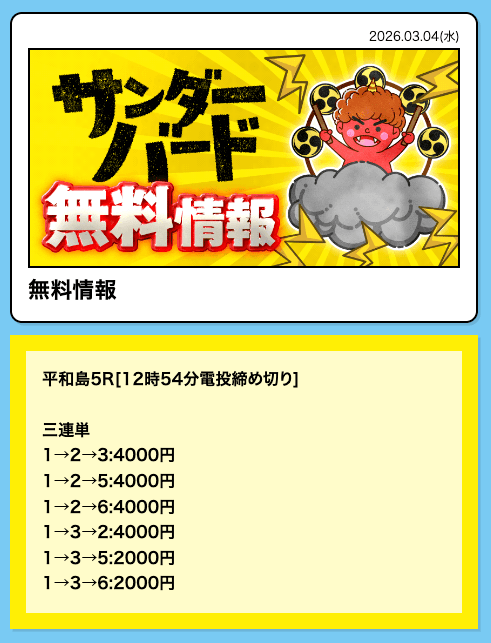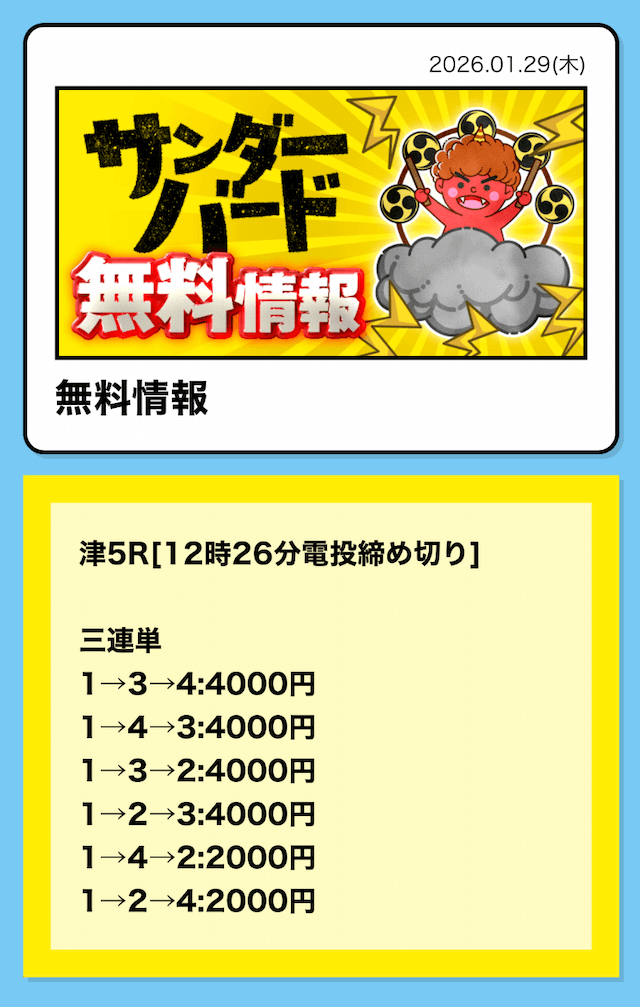 つまり、競艇サンダーバードの無料予想は「①-③-④」に4,000円を賭けていたということ。