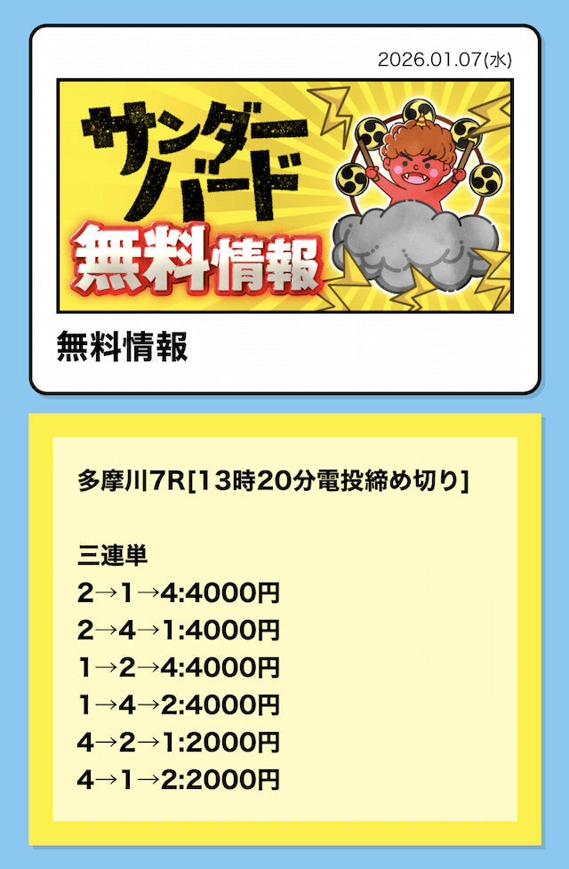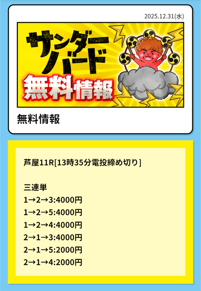 1日2レースが公開されるので、1日で舟券代を使い切れますね(2万円×2レース=4万円)。