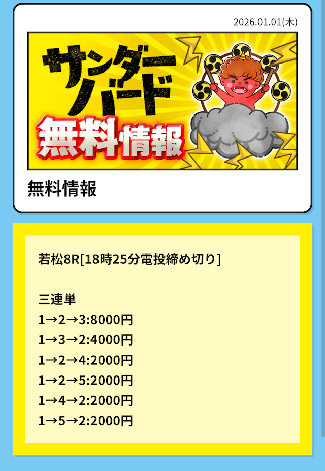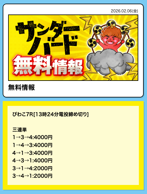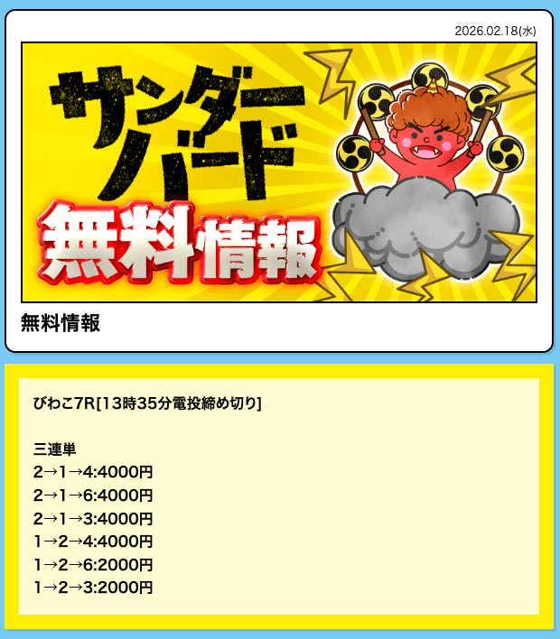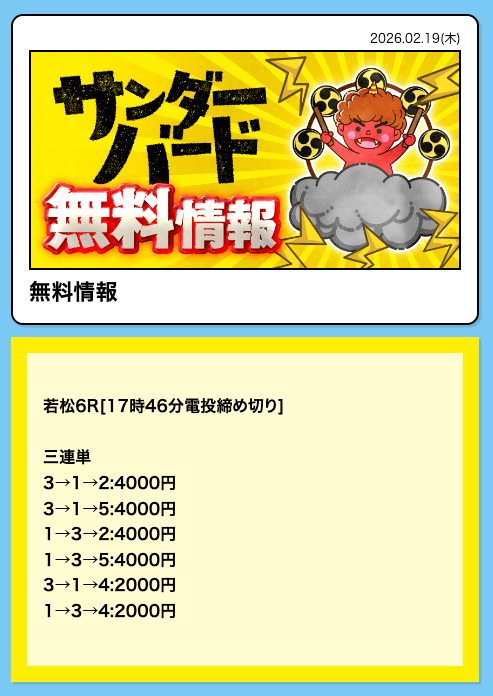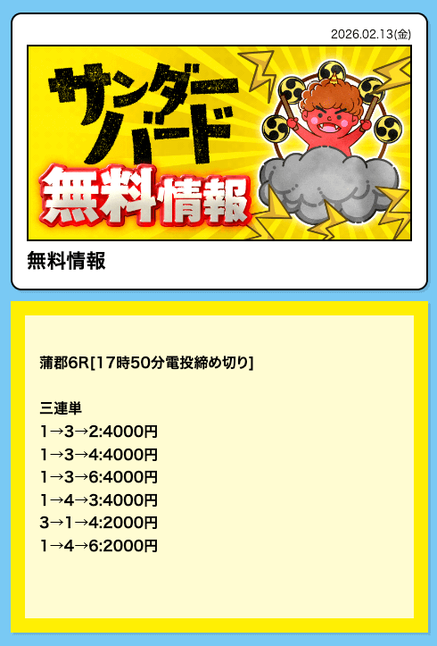 - 2026/02/20的中 無料予想で53,200円獲得2026/02/13的中 無料予想で29,600円獲得2026/02/12的中 無料予想で39,200円獲得2026/02/09的中 無料予想で29,200円獲得2026/02/05的中 無料予想で46,400円獲得2026/02/05的中 無料予想で20,200円獲得2026/02/04的中 無料予想で22,800円獲得2026/02/04的中 無料予想で35,600円獲得2026/01/30的中 無料予想で46,800円獲得2026/01/26的中 無料予想で48,000円獲得