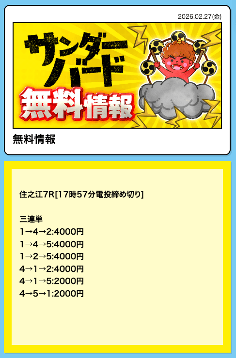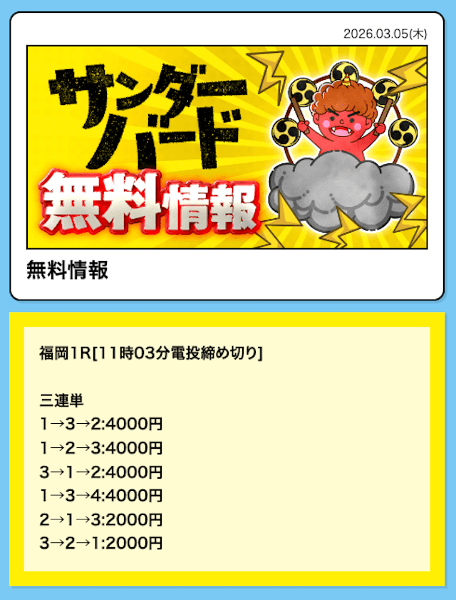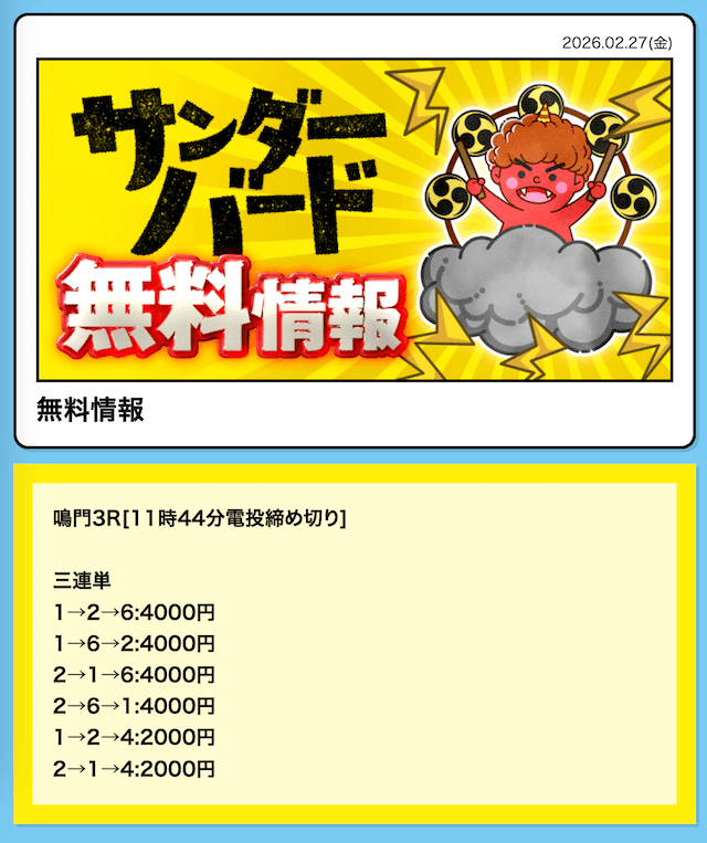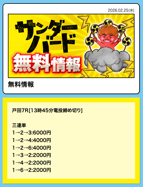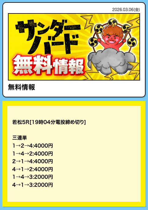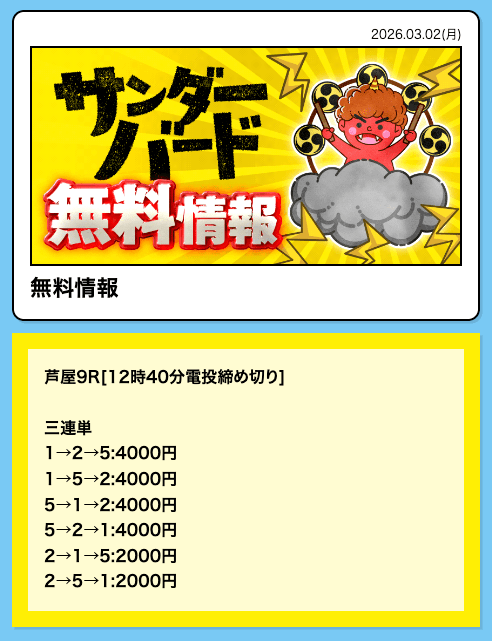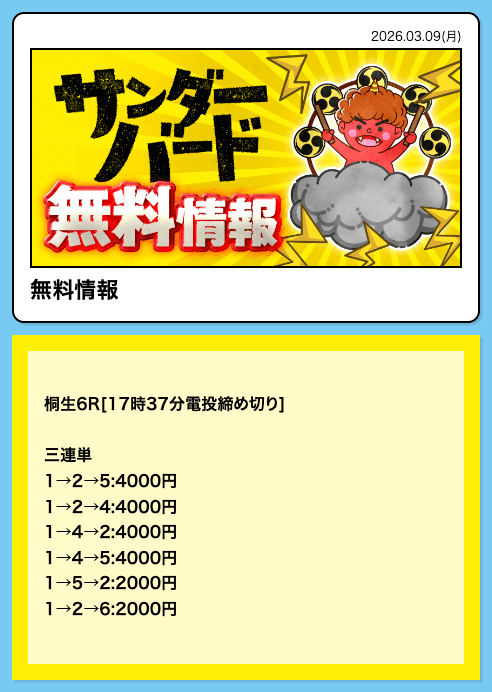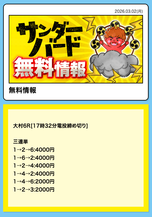 - 2026/03/09的中 無料予想で58,400円獲得2026/03/04的中 無料予想で84,600円獲得2026/03/02的中 無料予想で35,200円獲得2026/02/25的中 無料予想で24,400円獲得2026/02/20的中 無料予想で53,200円獲得2026/02/13的中 無料予想で29,600円獲得2026/02/12的中 無料予想で39,200円獲得2026/02/09的中 無料予想で29,200円獲得2026/02/05的中 無料予想で46,400円獲得2026/02/05的中 無料予想で20,200円獲得