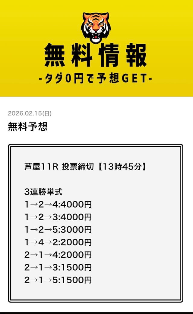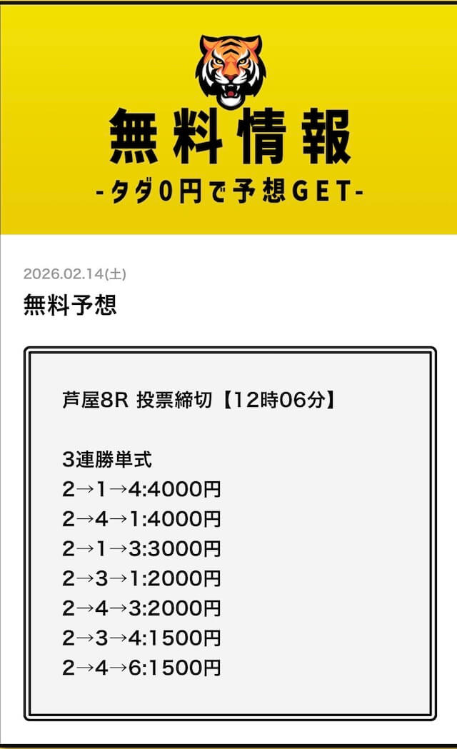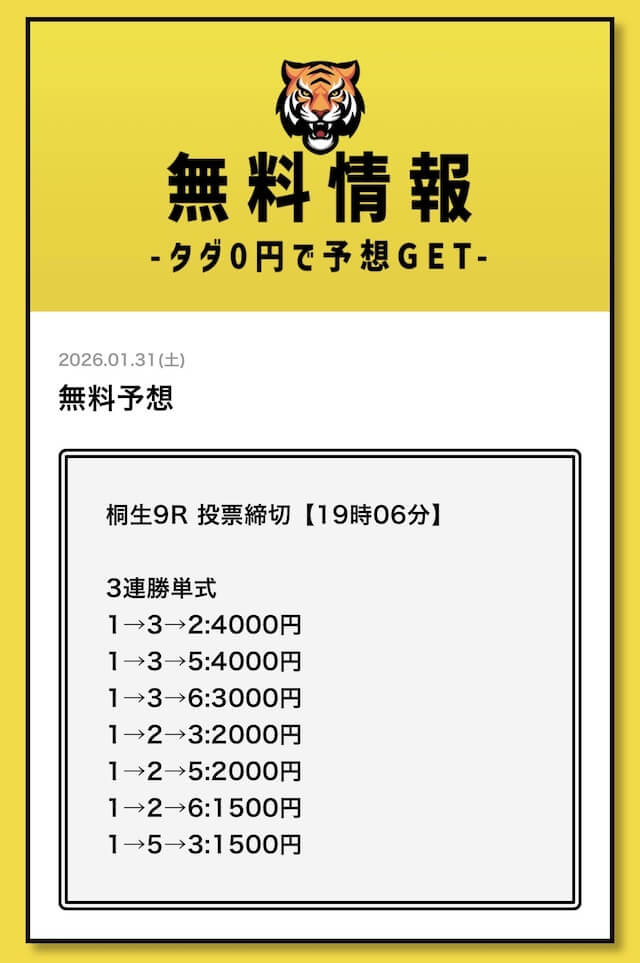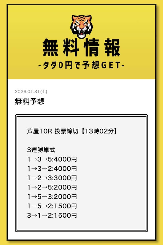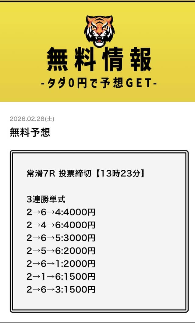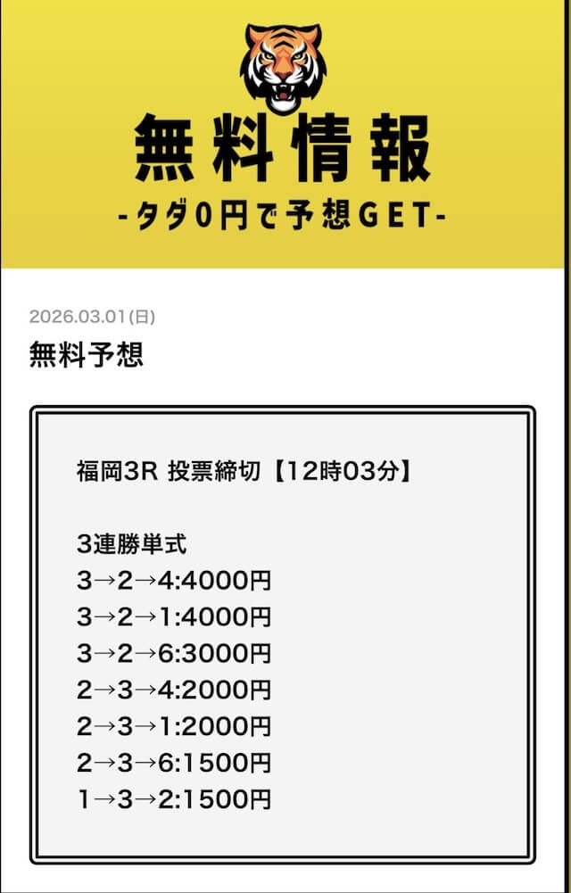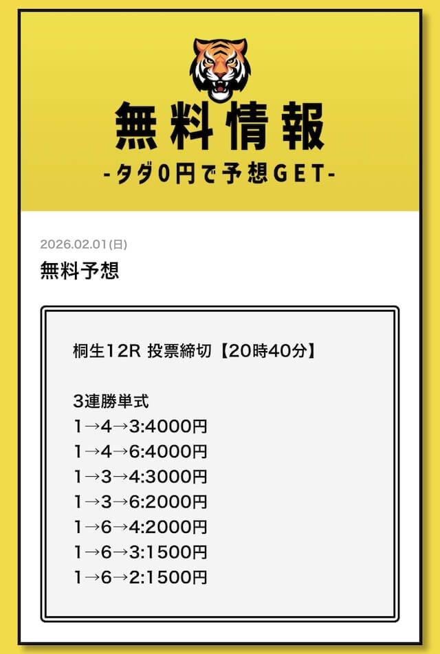 無料予想については、毎日2レース分公開されていることを確認済みです。