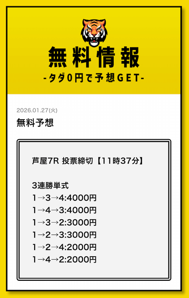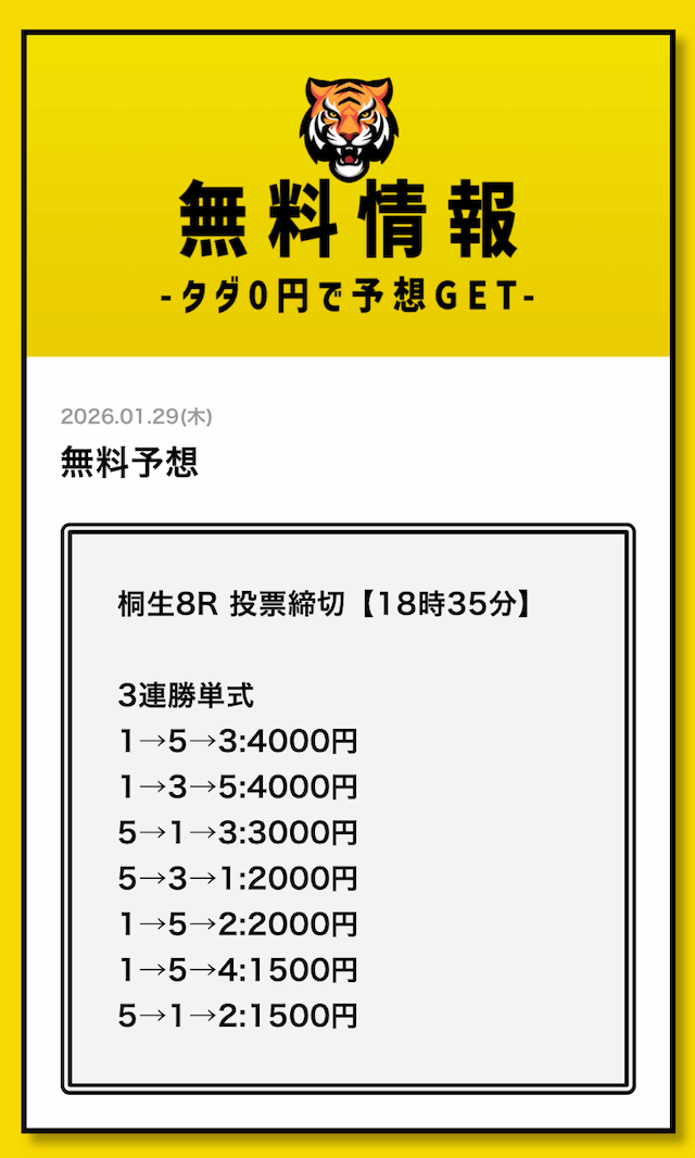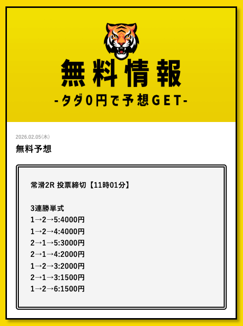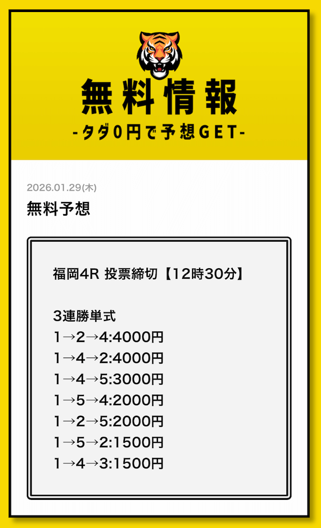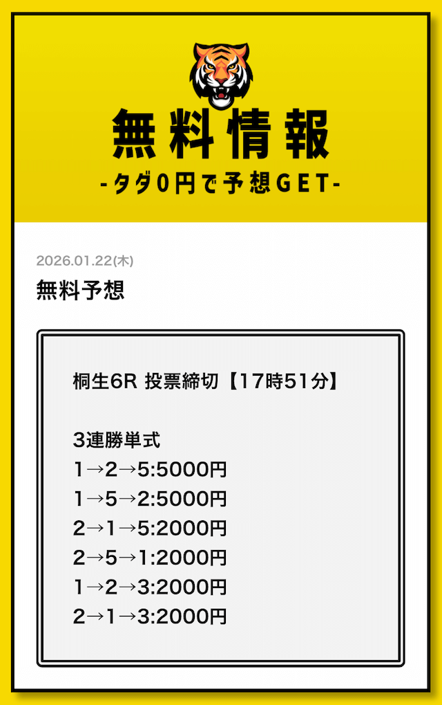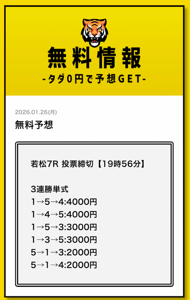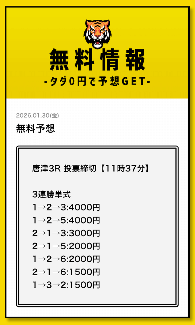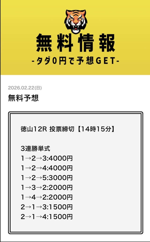 無料予想については、毎日2レース分公開されていることを確認済みです。