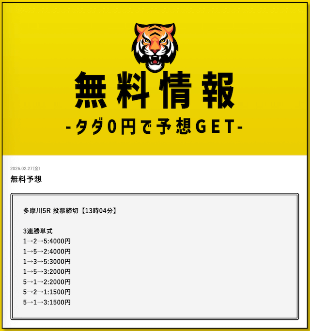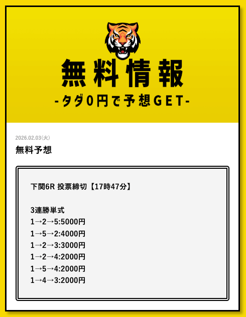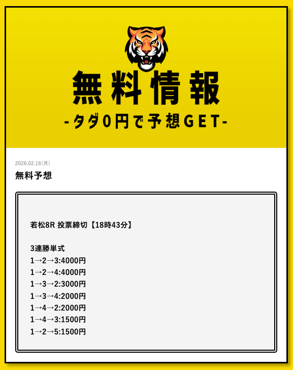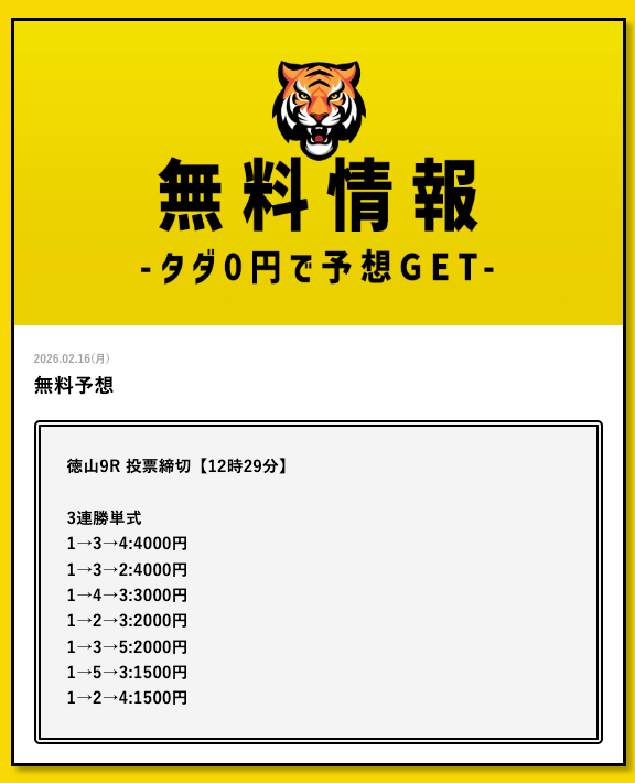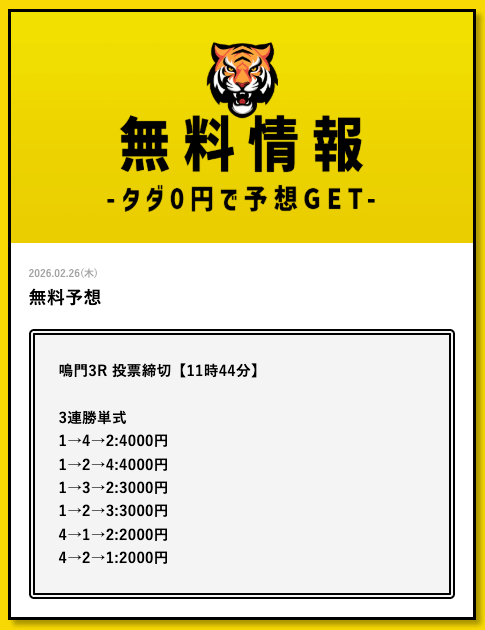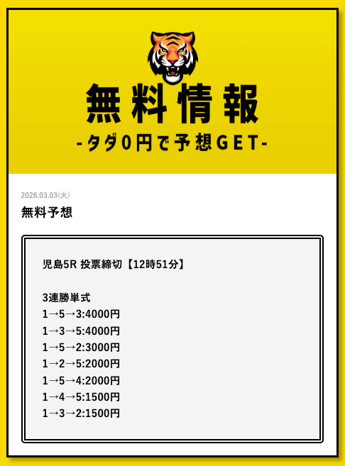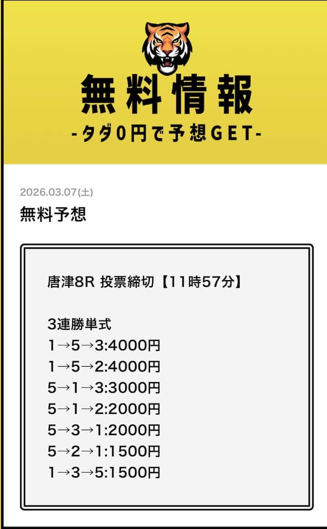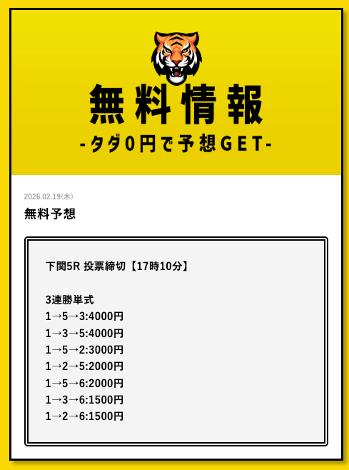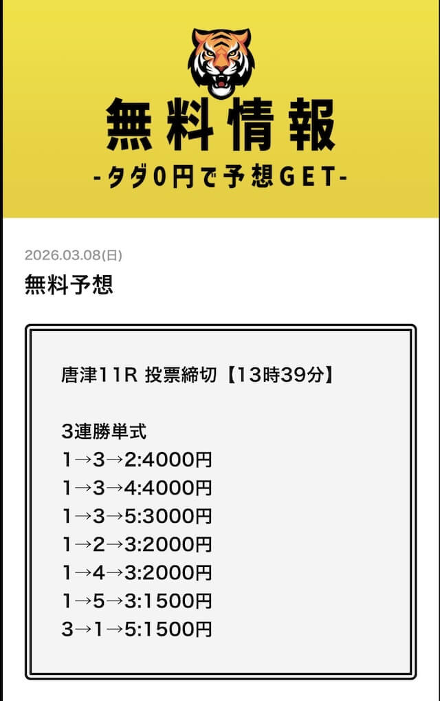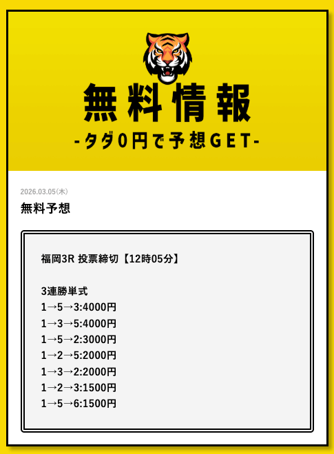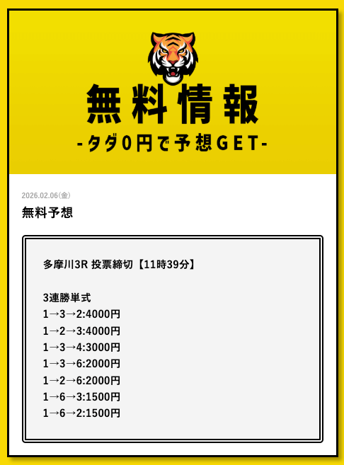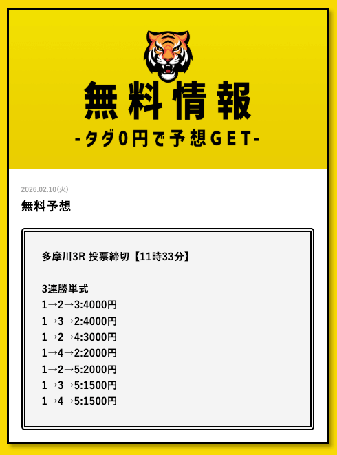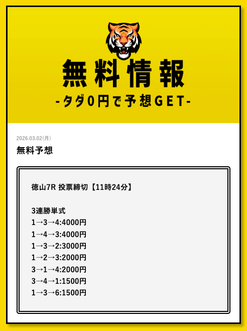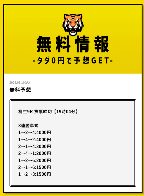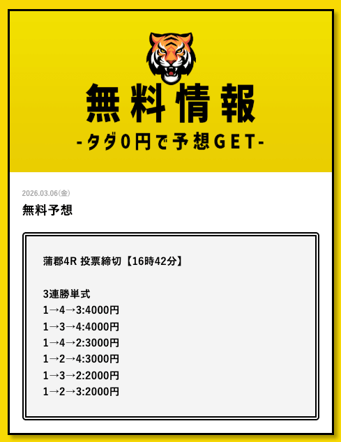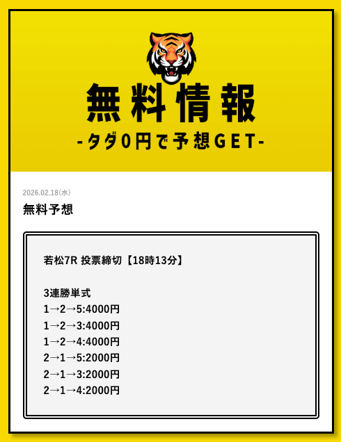 - 2026/03/11的中 無料予想で35,700円獲得2026/03/09的中 無料予想で30,800円獲得2026/03/09的中 無料予想で22,500円獲得2026/03/06的中 無料予想で25,400円獲得2026/03/05的中 無料予想で56,800円獲得2026/03/03的中 無料予想で19,650円獲得2026/03/02的中 無料予想で46,200円獲得2026/02/24的中 無料予想で131,600円獲得2026/02/24的中 無料予想で45,000円獲得2026/02/20的中 無料予想で48,000円獲得
