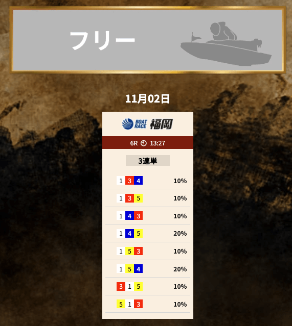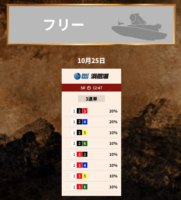 - 無料予想からでも十分戦える。精度が高すぎるし、丸乗りするだけで大金を獲得できた。だいたい回収率は140%、的中率は60%くらいに落ち着くかな。バランスが良いから、タイミングに左右されずに大金を得られる。投稿日:2025/08/23