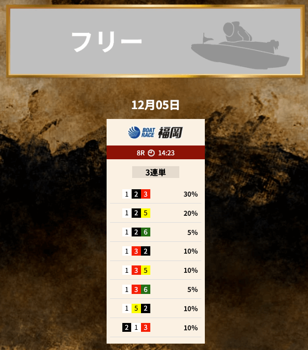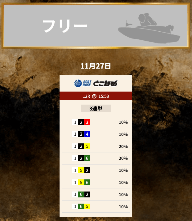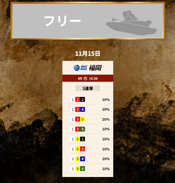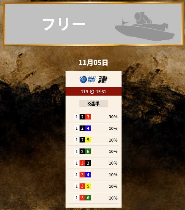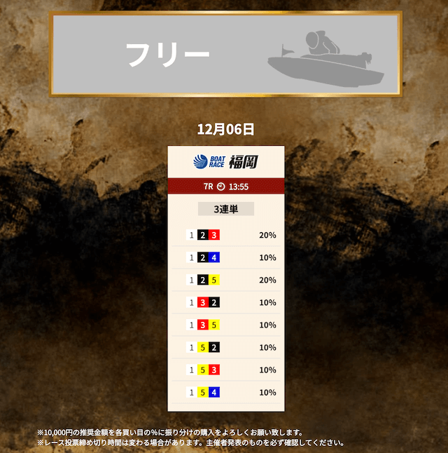 買い目は①⑤号艇を軸に、②③⑥号艇を絡める組み合わせとなっている。