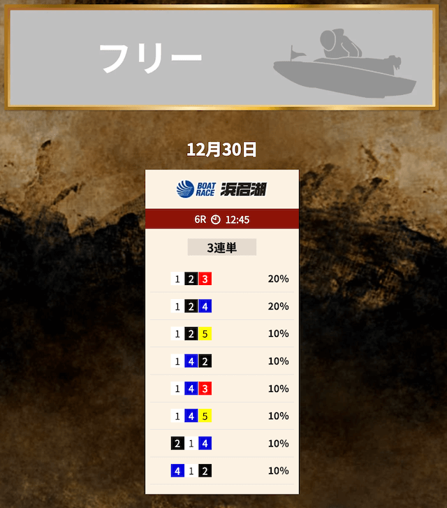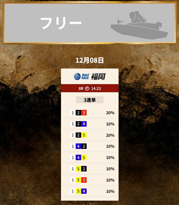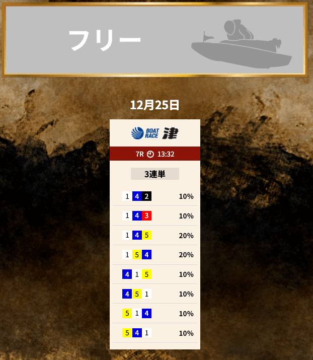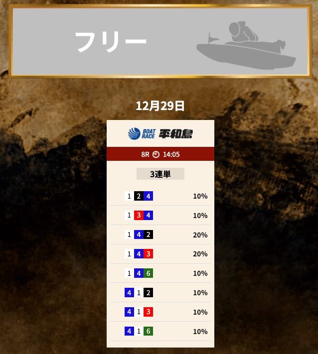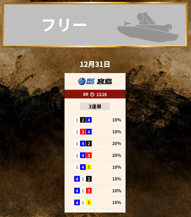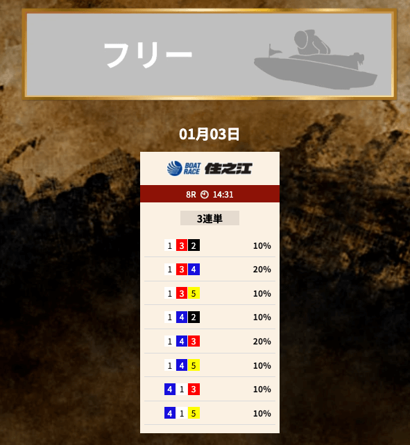 - 競艇トレジャーハンターの無料予想は1日1Rしかないのが残念だ・・・。ただ精度は悪くない。2R公開するサイトが多いから、頑張ってほしいのだが・・・。有料予想にいきますか・・・ww投稿日:2025/08/22